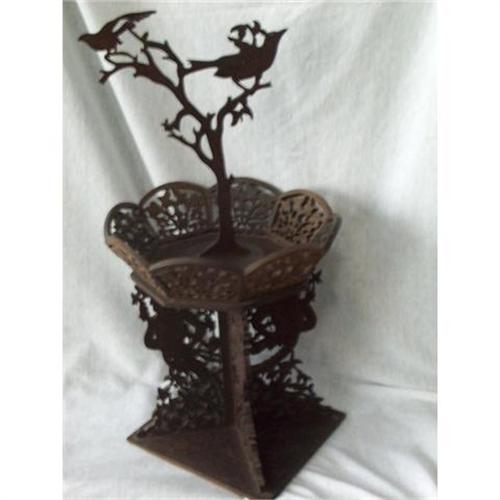 This vintage handcrafted wooden basket was made by Ira Leonard, Watervilet, Michigan. He was born in 1857 and died in 1946. The basket is supported by four cut out panels that feature a mythical male figure. In the center of the basket on top is a cut out tree with 2 birds in the branches. The condition is very good. This basket is very intricately cut. Email with questions