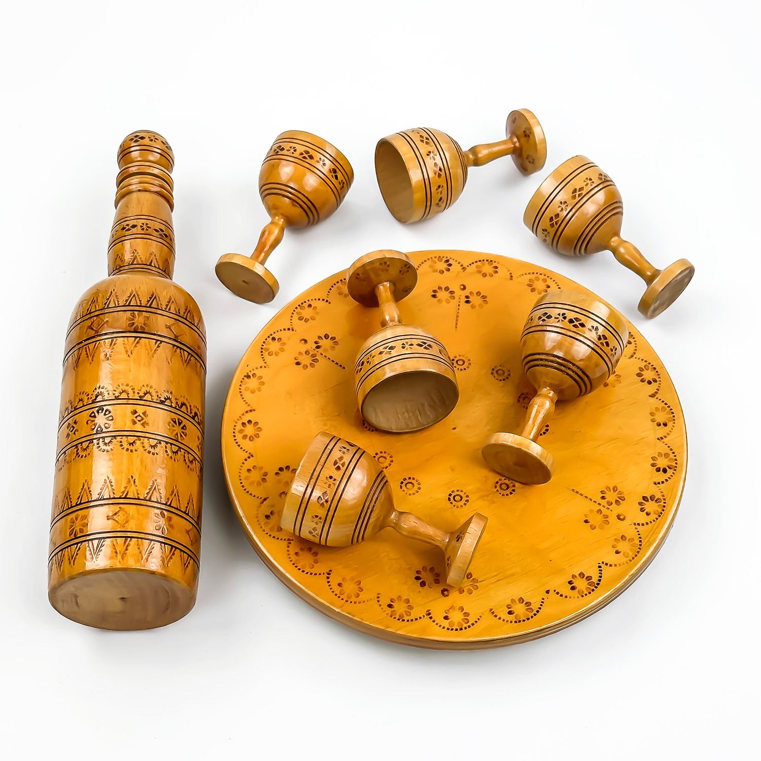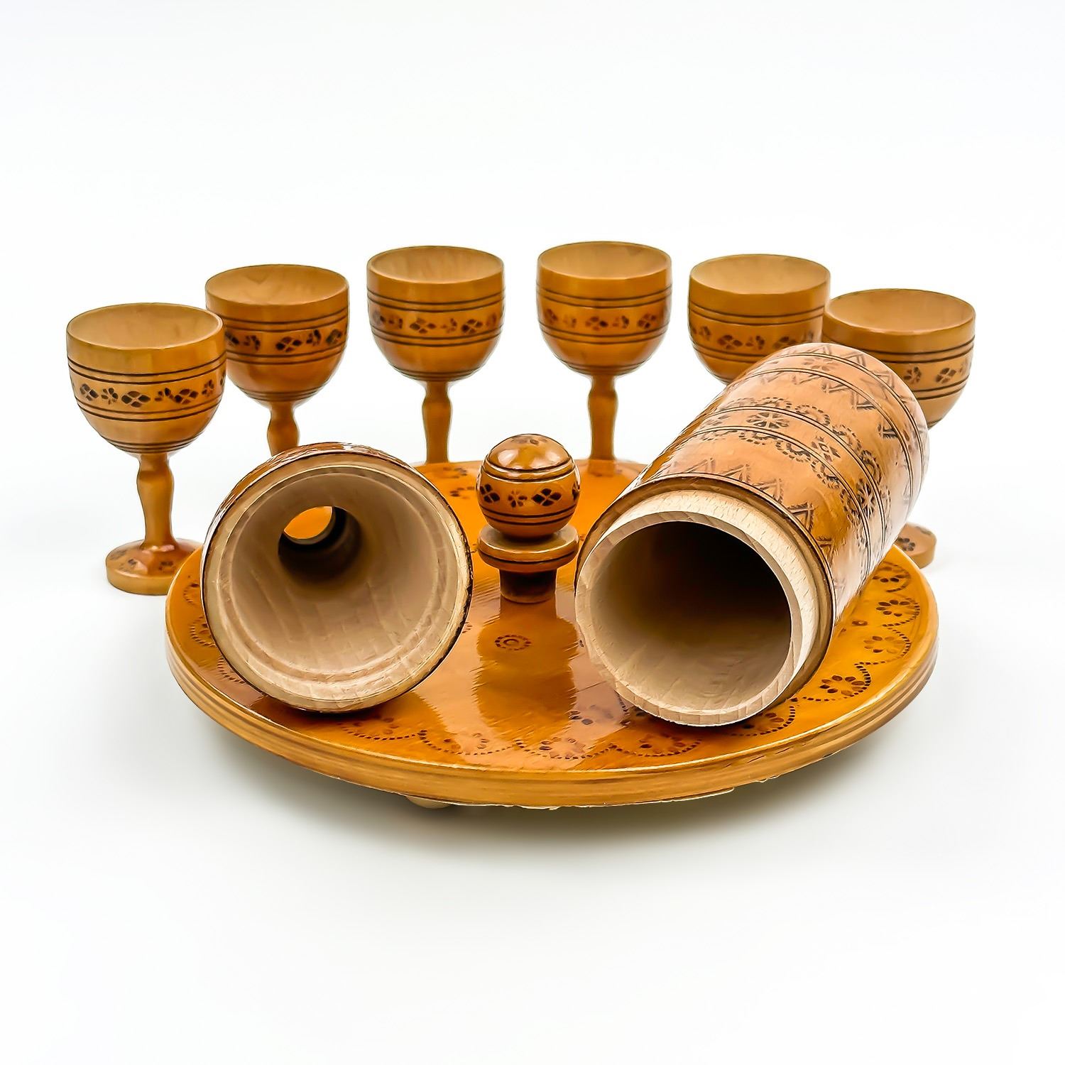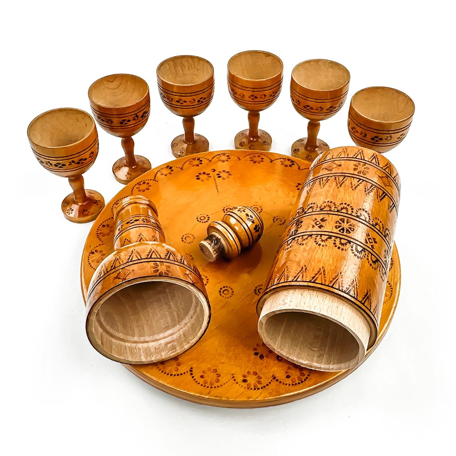 #8867 - VINTAGE HAND CRAFTED PYROGRAPHY WOODEN BOTTLE AND GOBLETS SET. UNKNOWN MAKER - MARKS ON BASE. I BELIEVE THEY MAY BE OF RUSSIAN (SOVIET UNION - USSR) ORIGIN…BUT NOT CERTAIN. BOTTLE MEASURES: 9” (23 CM) TALL BY 2” (5 CM) DIAMETER.GOBLETS ARE 2***ITEM(S) LOCATED IN LETHBRIDGE ALBERTA. FREE TRANSPORT TO EDMONTON OFFICE AVAILABLE FOR THIS AUCTION. WORLDWIDE SHIPPING IS AVAILABLE FOR ALL ITEMS