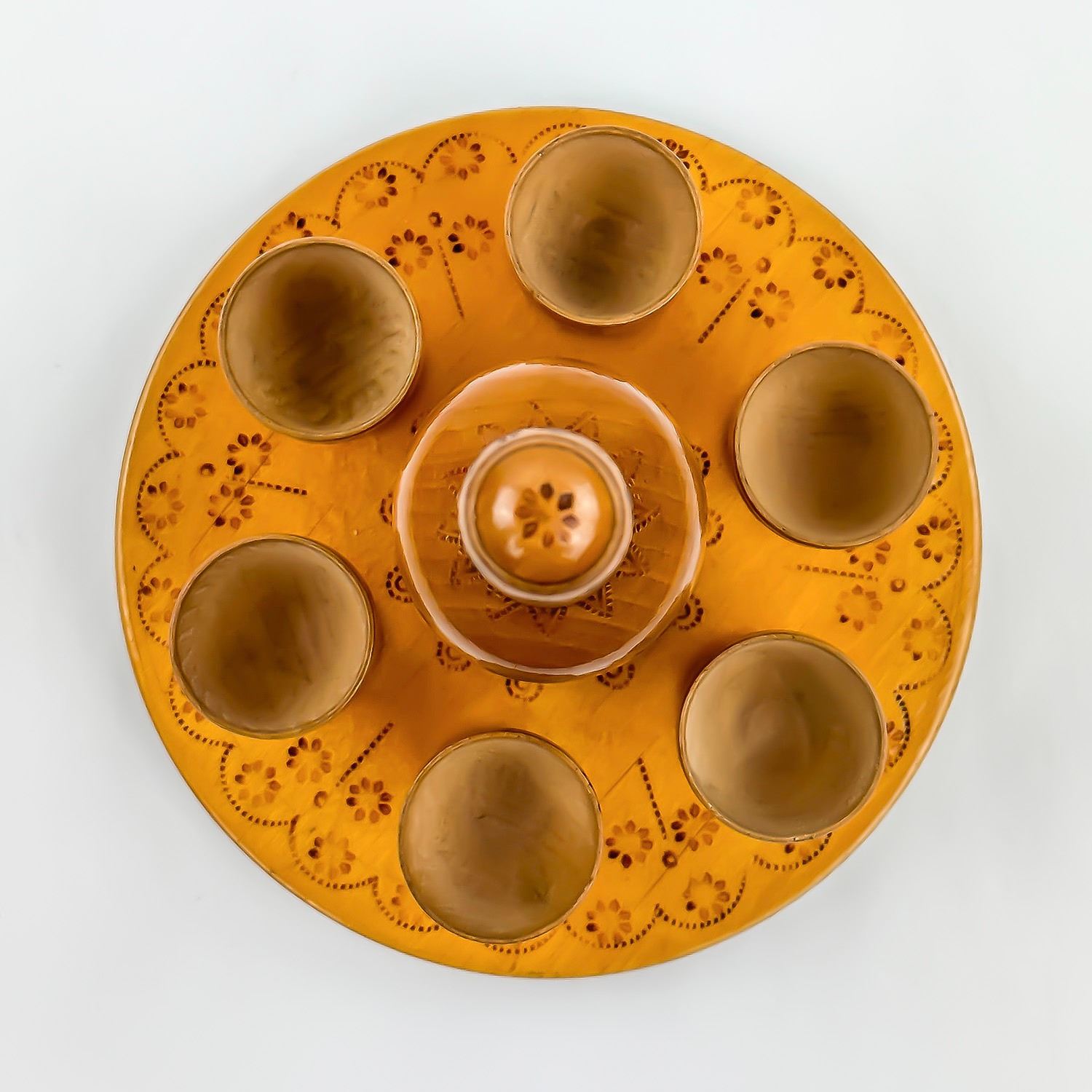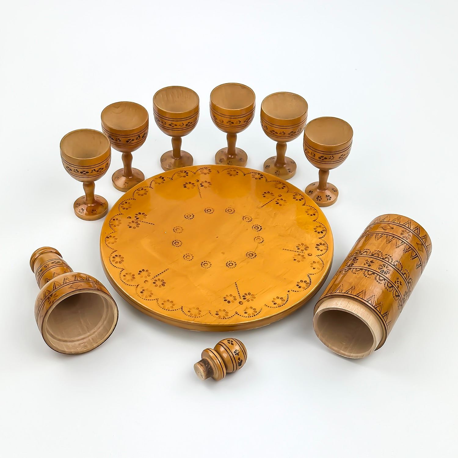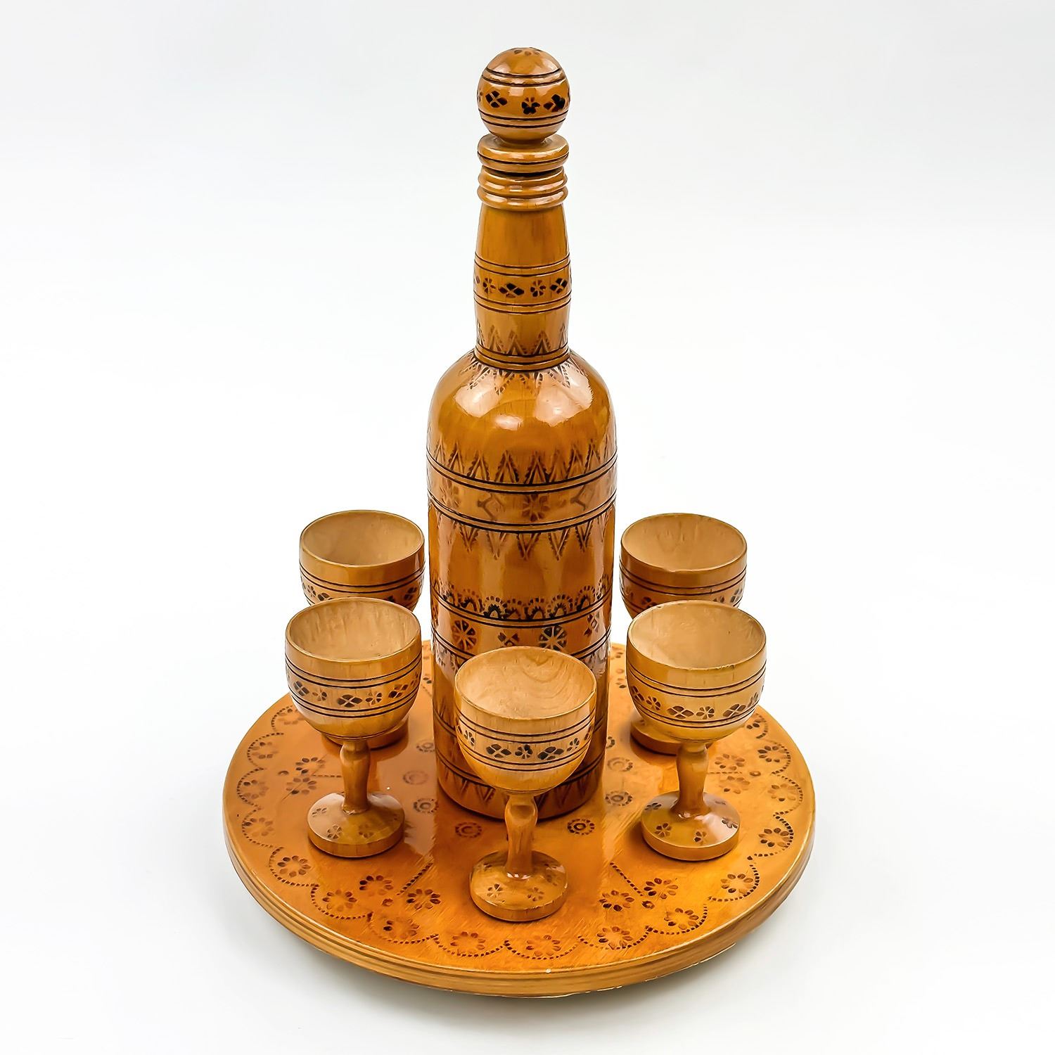 #8867 - VINTAGE HAND CRAFTED PYROGRAPHY WOODEN BOTTLE AND GOBLETS SET. UNKNOWN MAKER - MARKS ON BASE. I BELIEVE THEY MAY BE OF RUSSIAN (SOVIET UNION - USSR) ORIGIN…BUT NOT CERTAIN. BOTTLE MEASURES: 9” (23 CM) TALL BY 2” (5 CM) DIAMETER.GOBLETS ARE 2***ITEM(S) LOCATED IN LETHBRIDGE ALBERTA. FREE TRANSPORT TO EDMONTON OFFICE AVAILABLE FOR THIS AUCTION. WORLDWIDE SHIPPING IS AVAILABLE FOR ALL ITEMS
