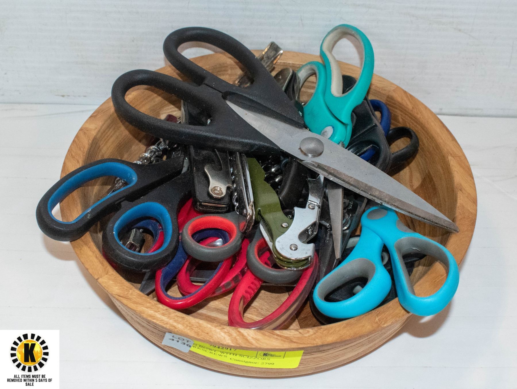 WOODEN BOWL WITH SCIZZORS AND CORKSCREWS
