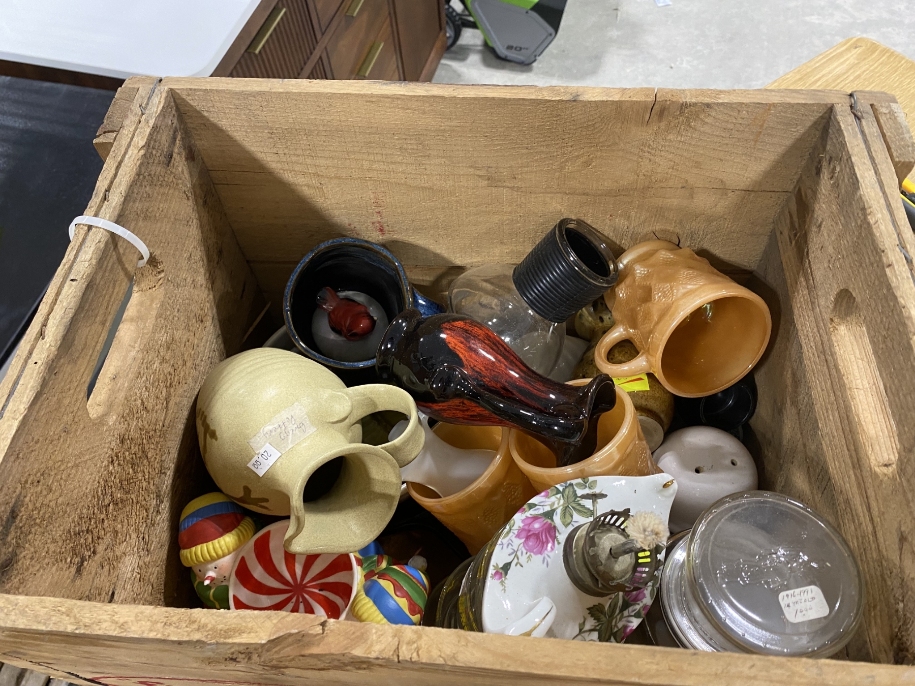 WOODEN BOX LOT OF ASSORTED GLASS