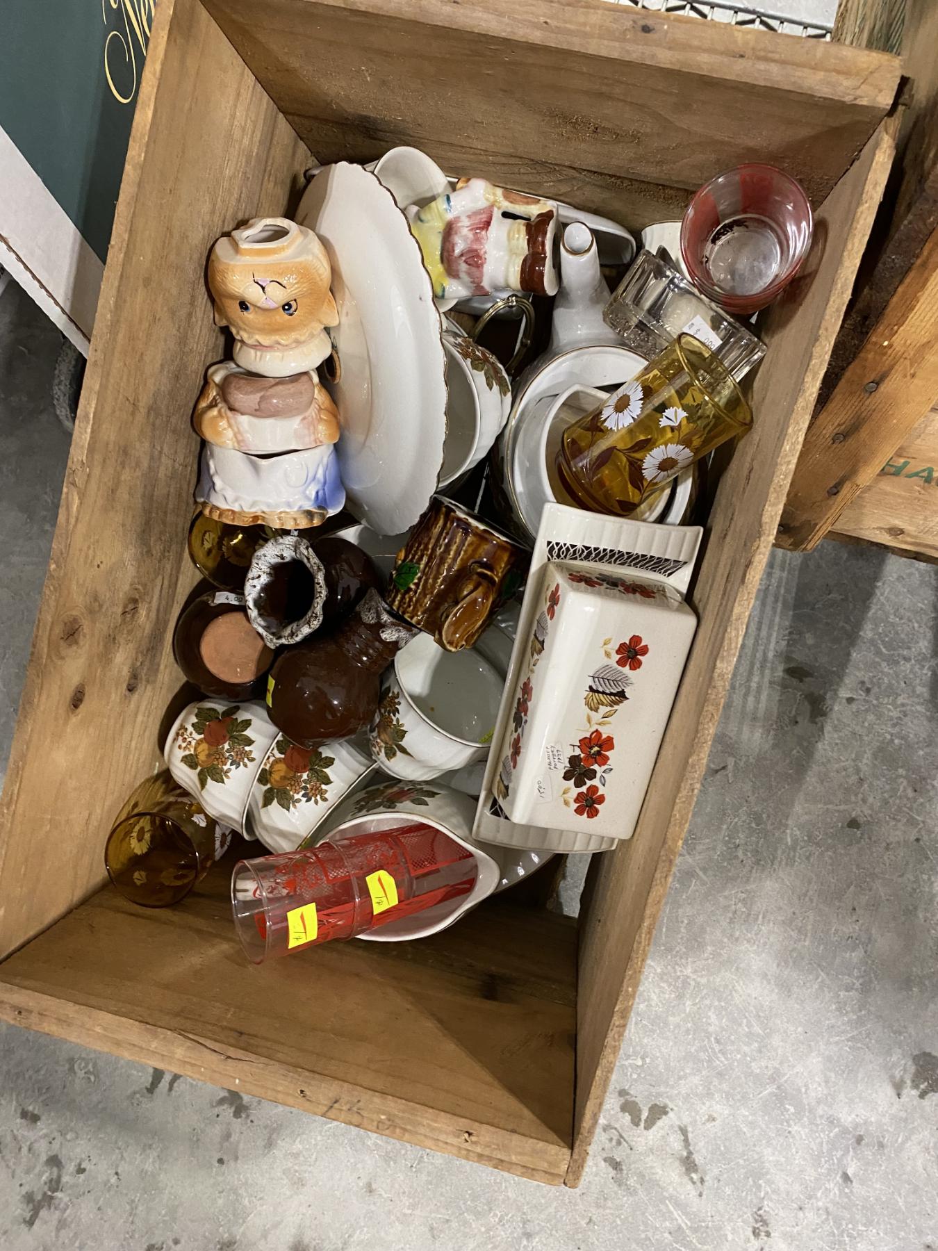 WOODEN BOX LOT OF ASSORTED GLASS