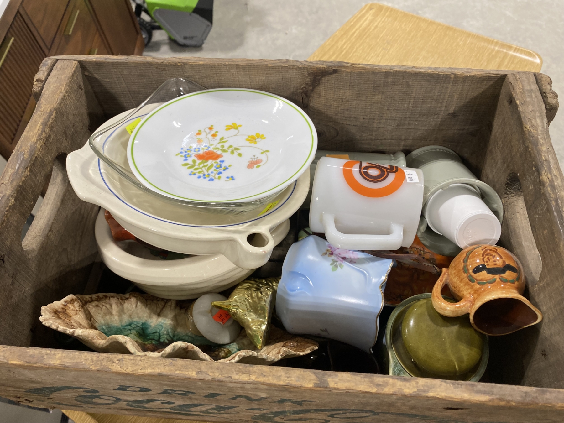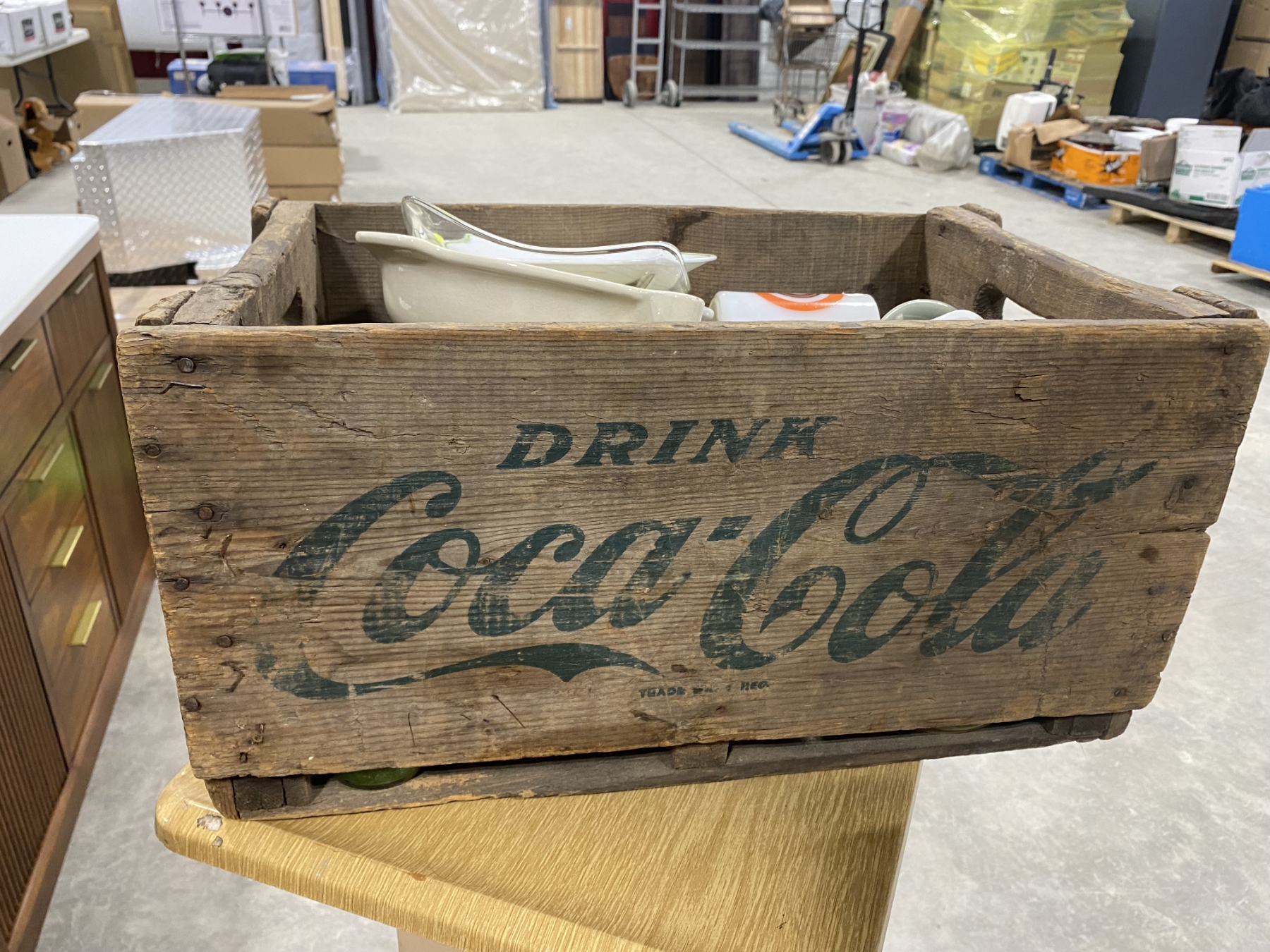 WOODEN BOX LOT OF ASSORTED GLASS