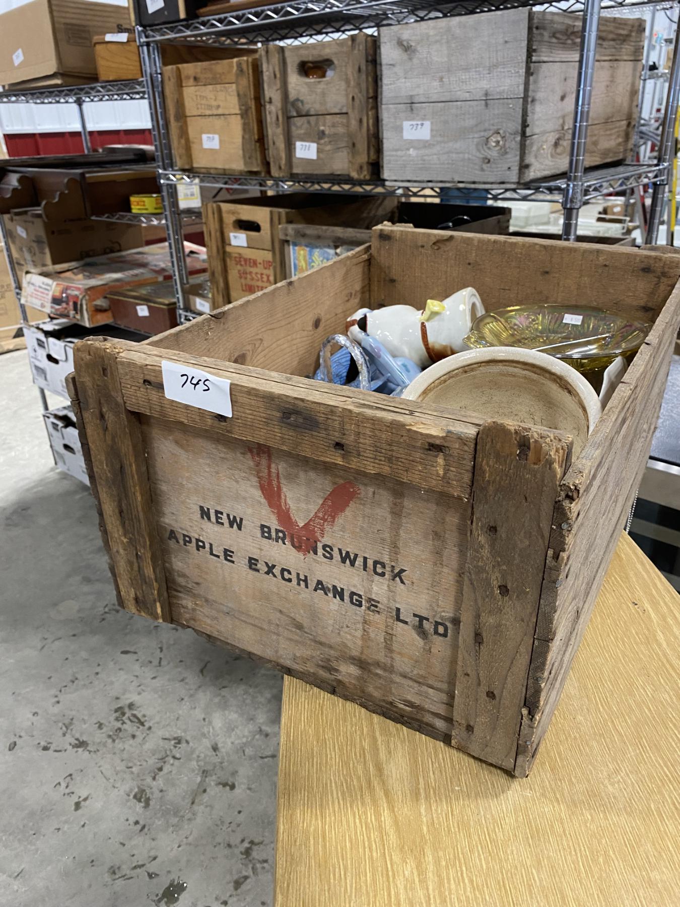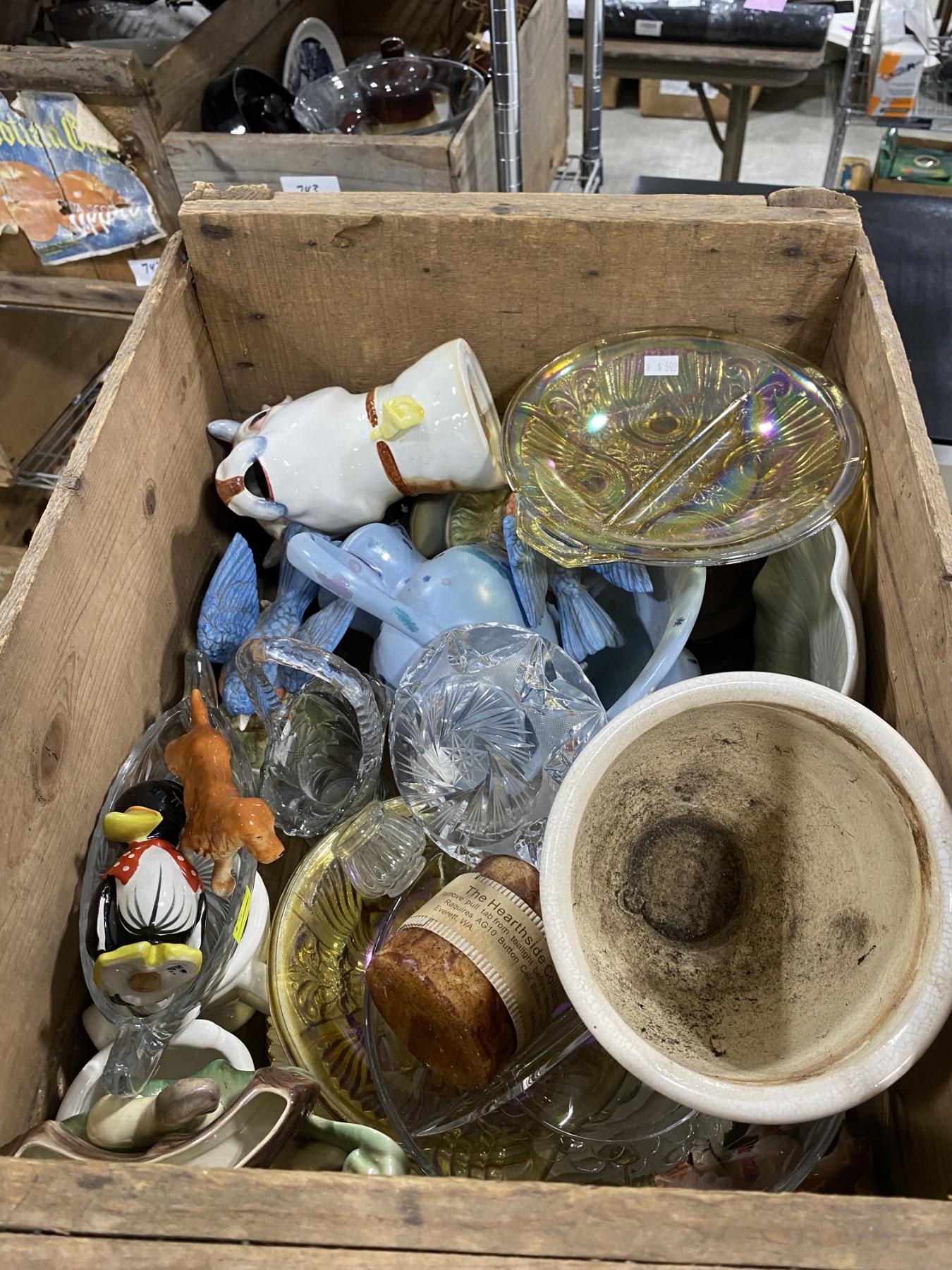 WOODEN BOX LOT OF ASSORTED GLASS