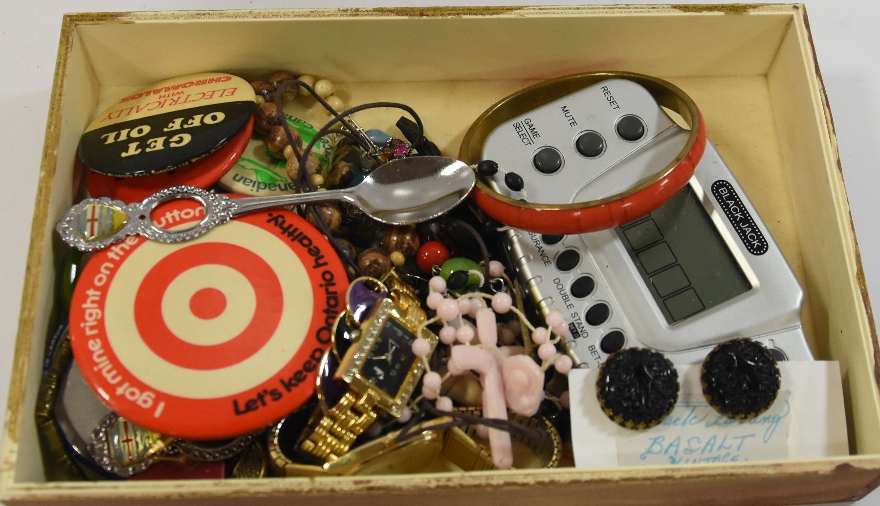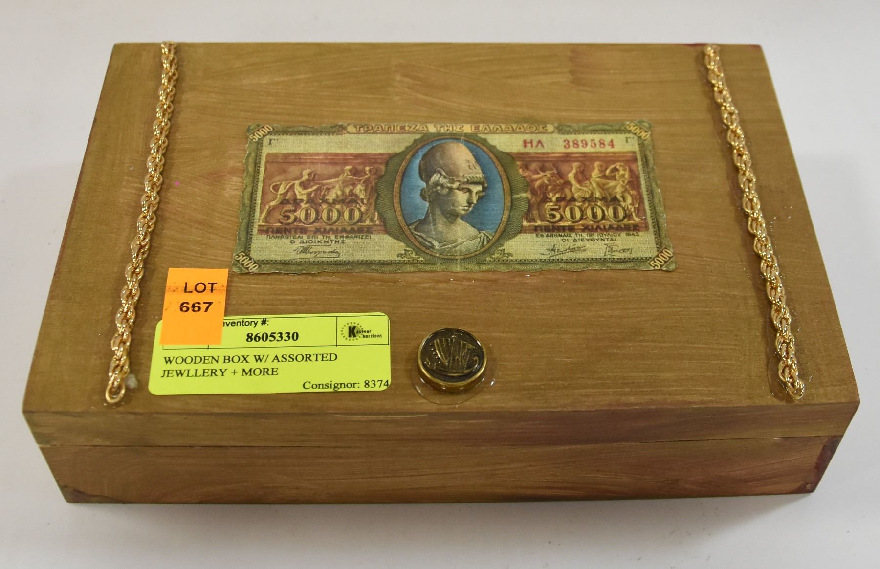 WOODEN BOX W/ ASSORTED JEWLLERY + MORE