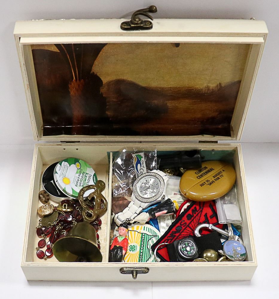 WOODEN BOX W/ MIXED VINTAGE JEWLLERY, BUTTONS, PIN