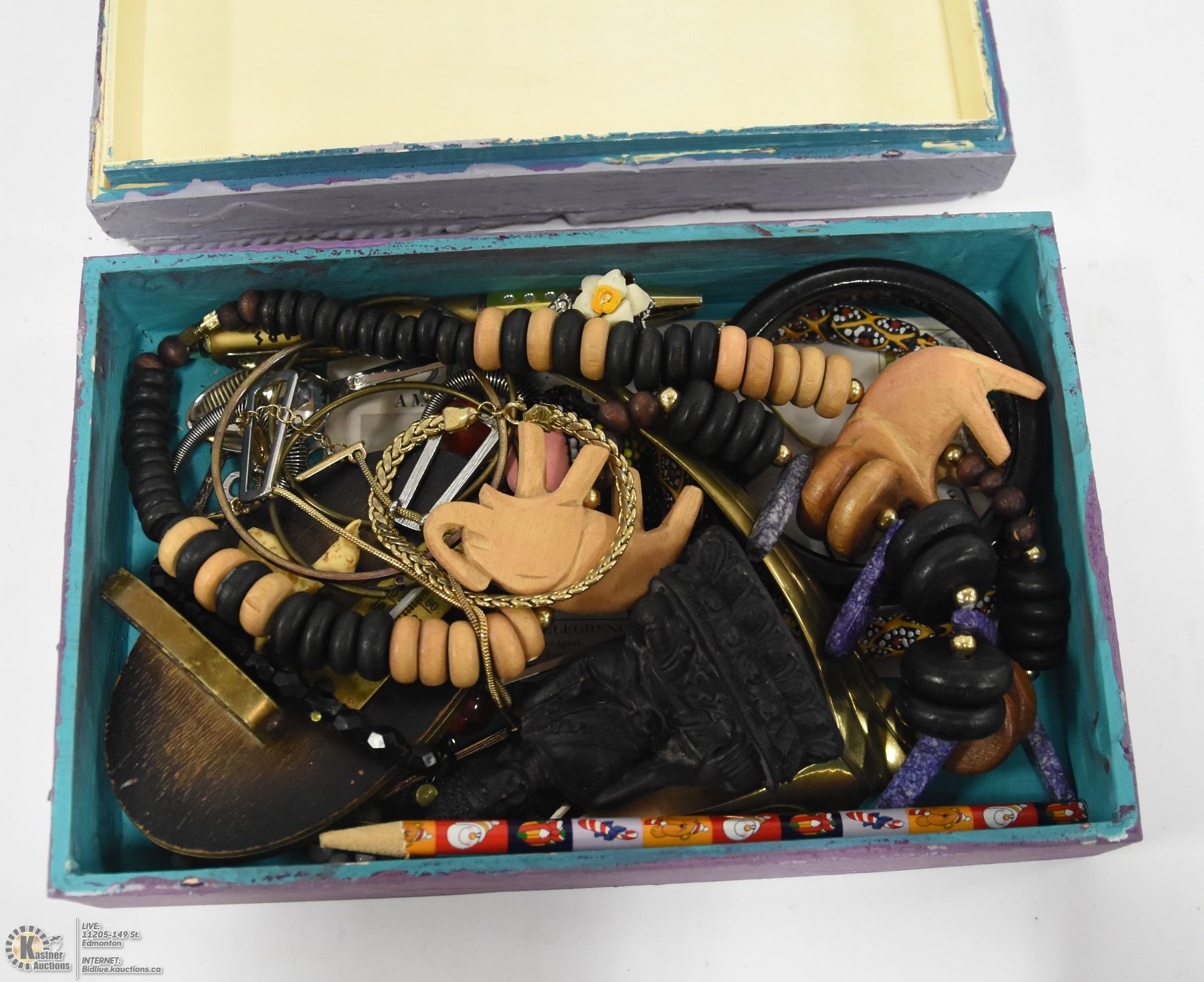 WOODEN BOX W/ VARIOUS ESTATE COLLECTIBLES + MORE