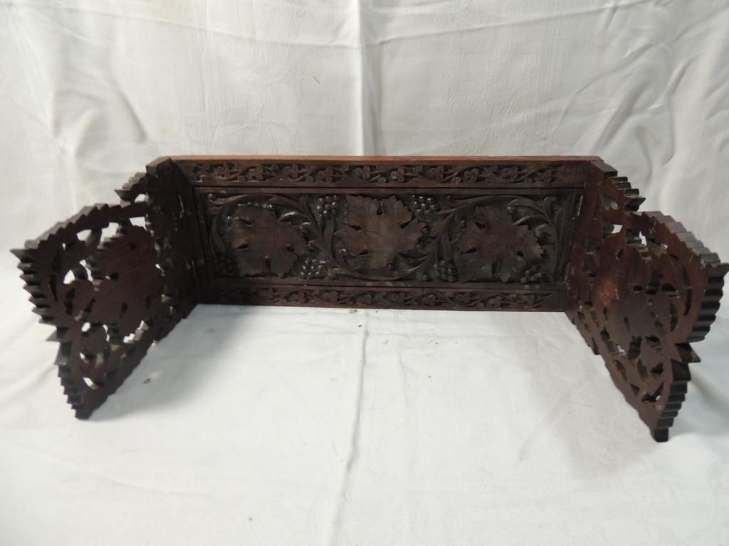 WOODEN CARVED LEAF DESIGN BOOK RACK. SIDES FOLD DOWN FOR EASY STORAGE. BOOK RACK. AS SHOWN. SEE PHOTO FOR MORE DETAILS.