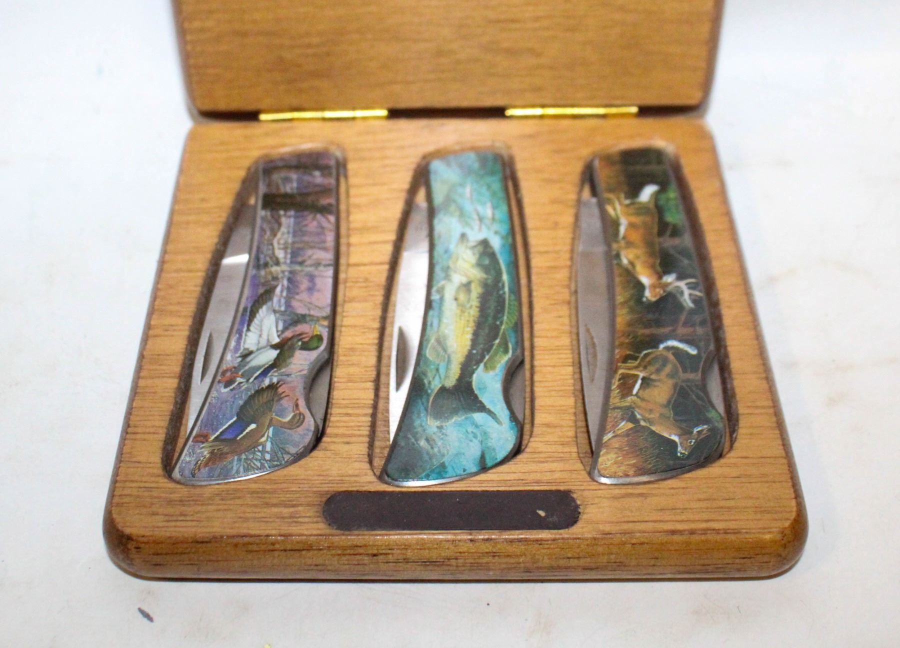 WOODEN CASED 3PC SET FOLDING KNIVES WILDLIFE THEME