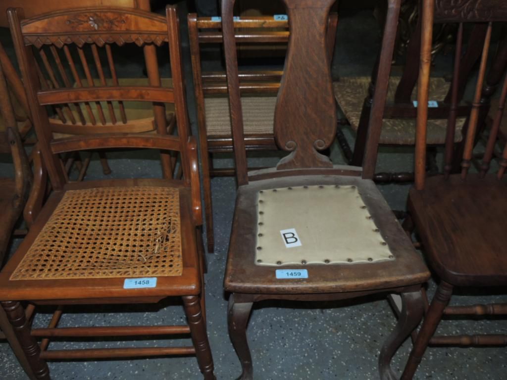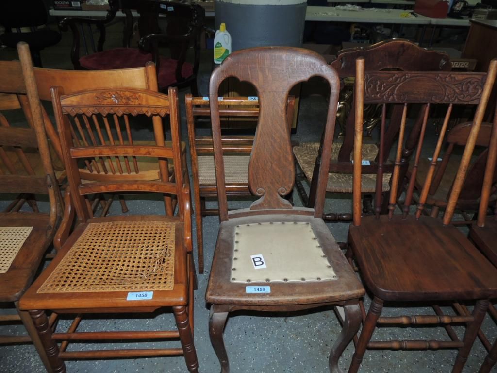 WOODEN CHAIR LEATHER SEAT. AS SHOWN. SEE PHOTO FOR MORE DETAILS.