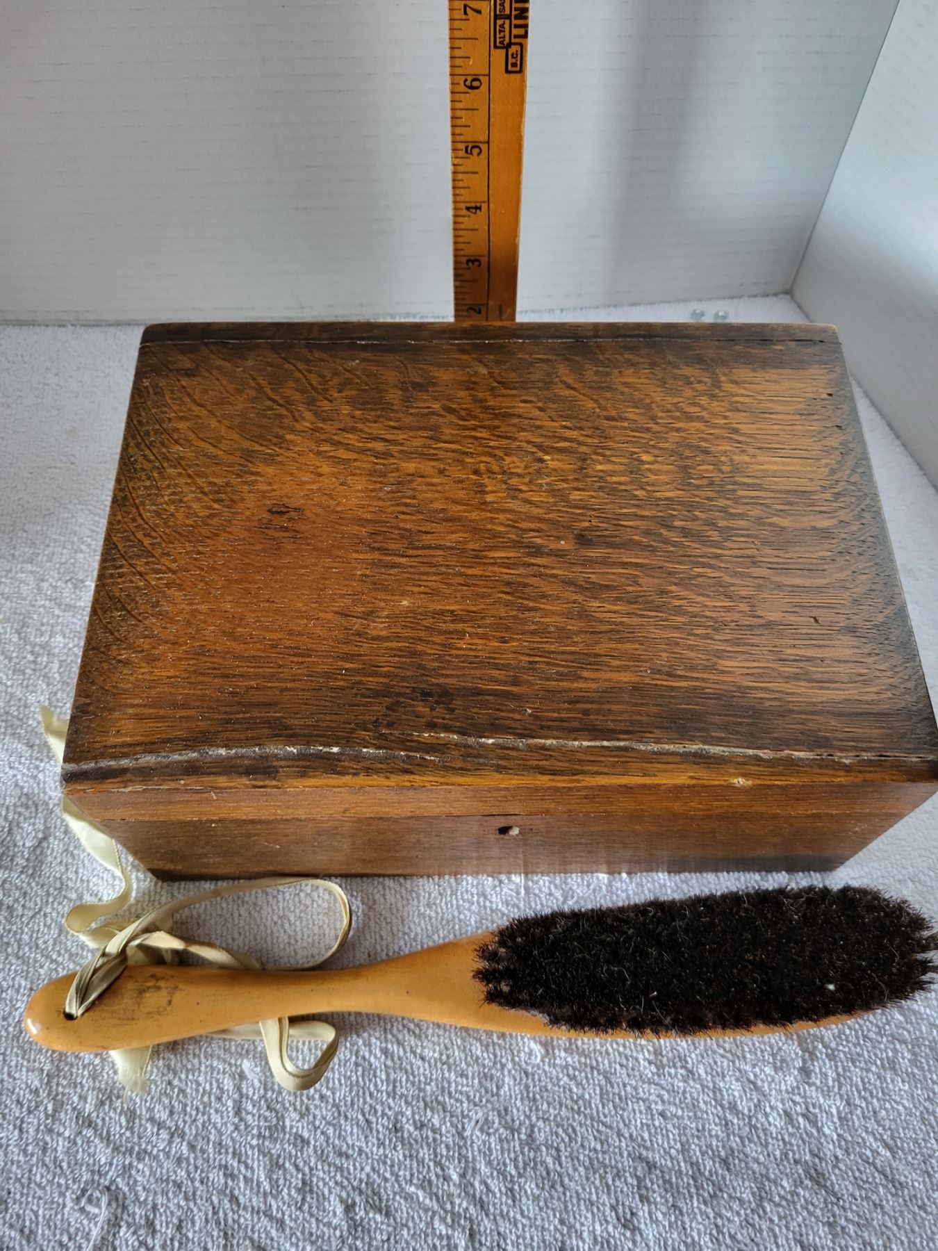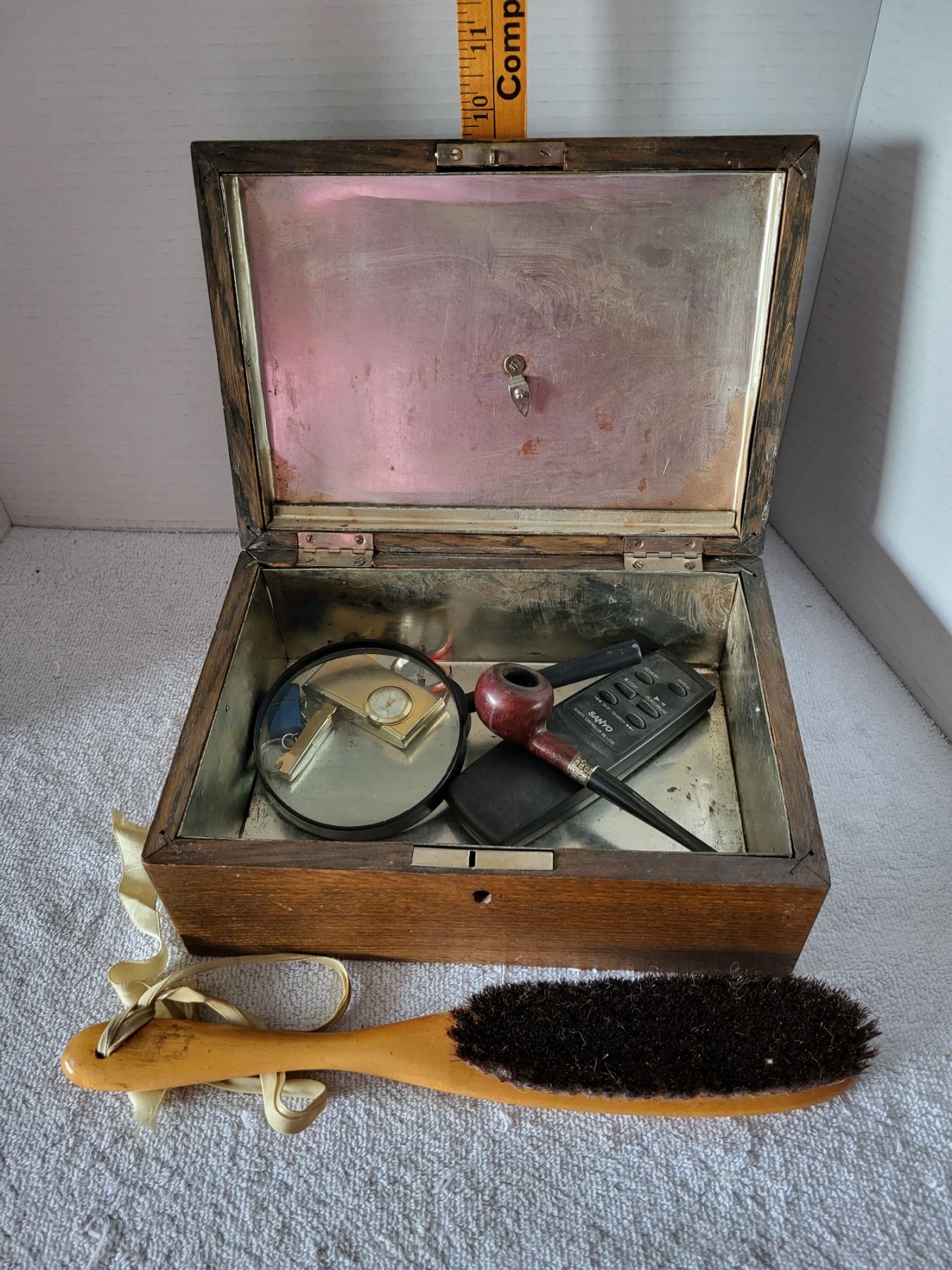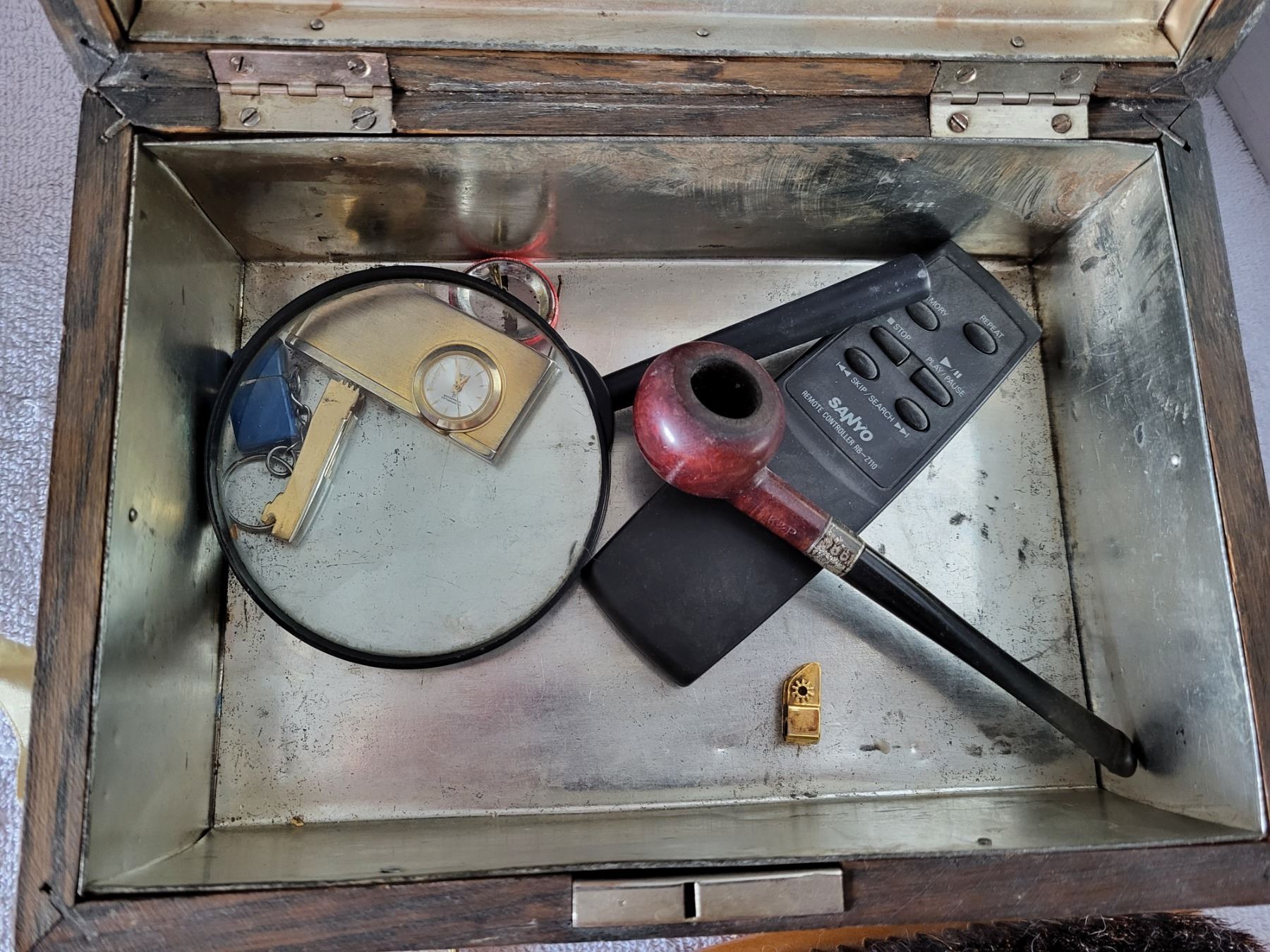 WOODEN CIGAR BOX WTIH RANDOM GOODIES (K&P PIPE) AND OTHER ODD GOODIES