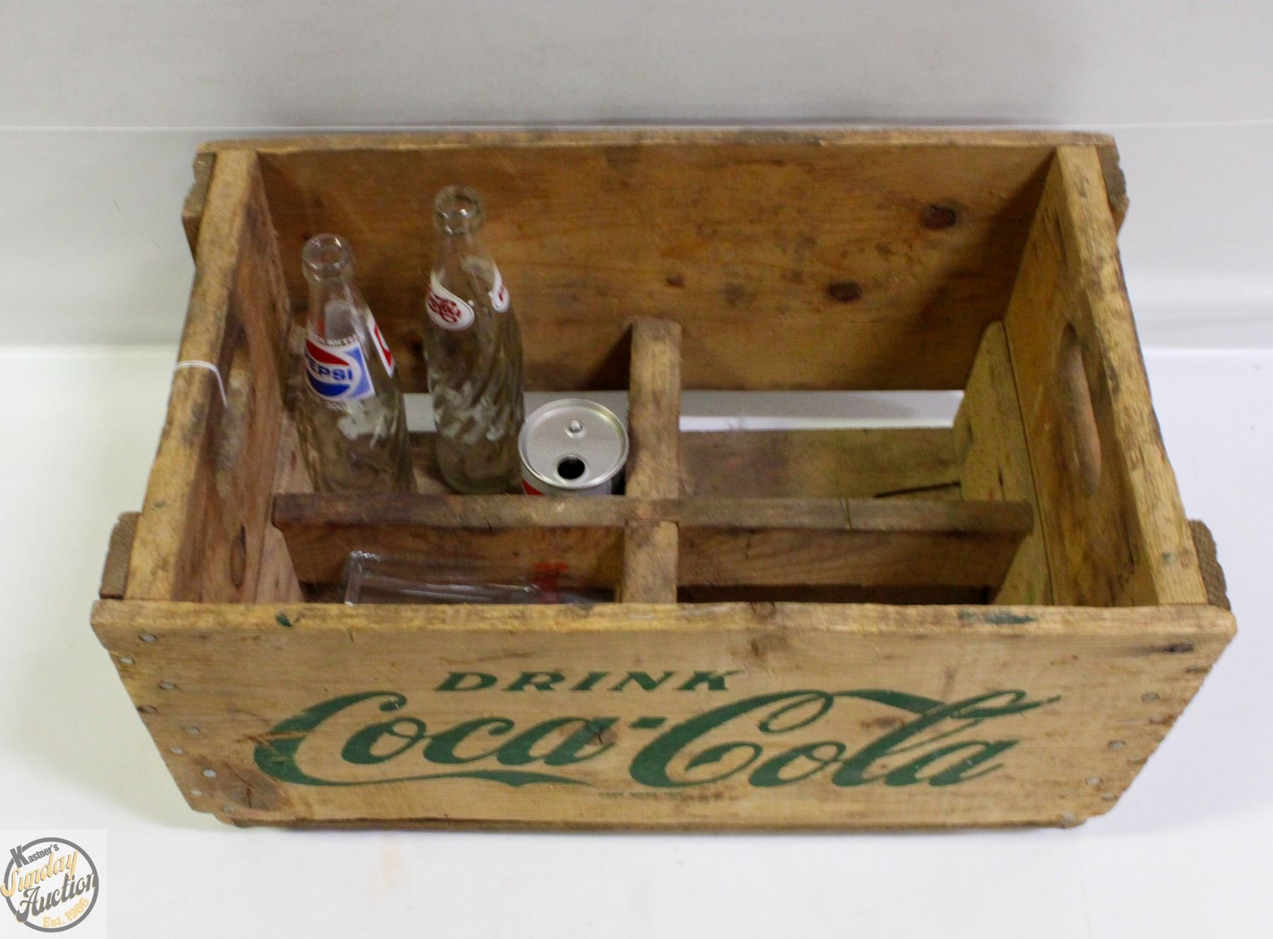 WOODEN CRATE WITH 2 COKE GLASSES, 2 PEPSI GLASS BOTTLES & 1 PEPSI CAN **ALL ITEMS MUST BE REMOVED BY 5PM SATURDAY, NOVEMBER 15TH 2025. ALL REMAINING ITEMS WILL BE SUBJECT TO A $6.00 PER DAY STORAGE CHARGE. ANY ITEMS REMAINING AFTER MONDAY, DECEMBER 1ST 2025 WILL BE CONSIDERED FORFEITED. NO REFUNDS WILL BE ISSUED FOR FORFEITED ITEMS. TO SCHEDULE A PICK UP APPOINTMENT CLICK HERE