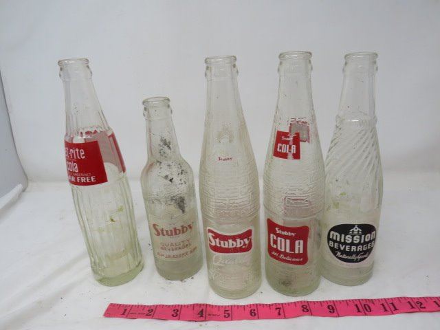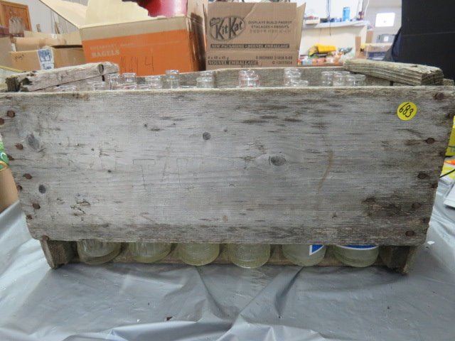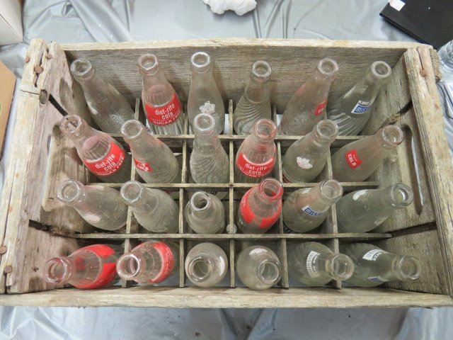 WOODEN CRATE W/24 POP BOTTLES (MISSION, STUBBY, DIET RITE, ETC)