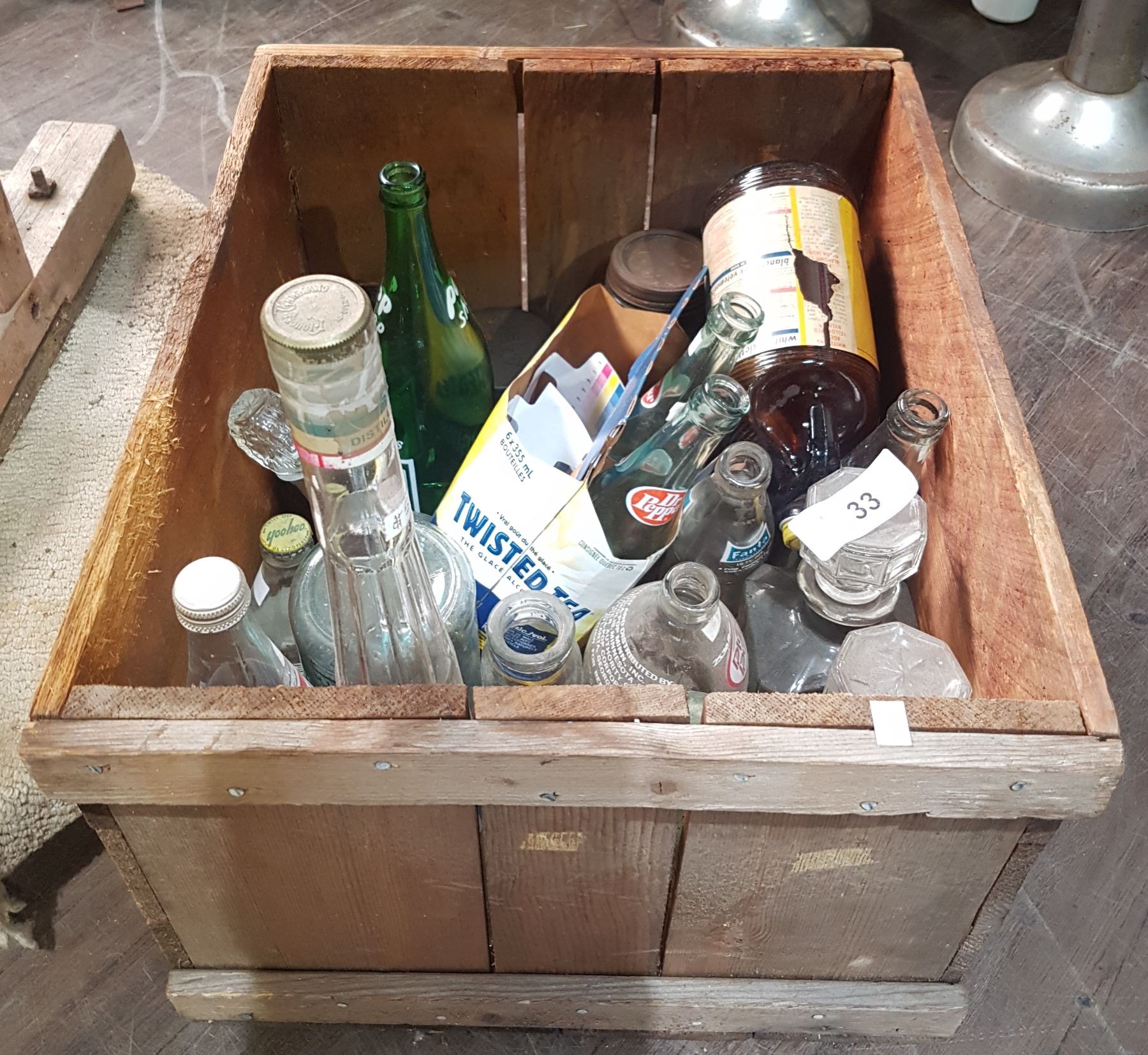 WOODEN CRATE W/MISC POP BOTTLES ETC