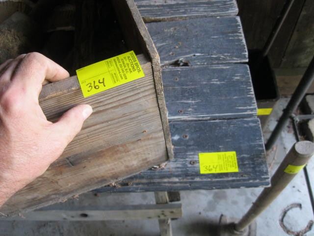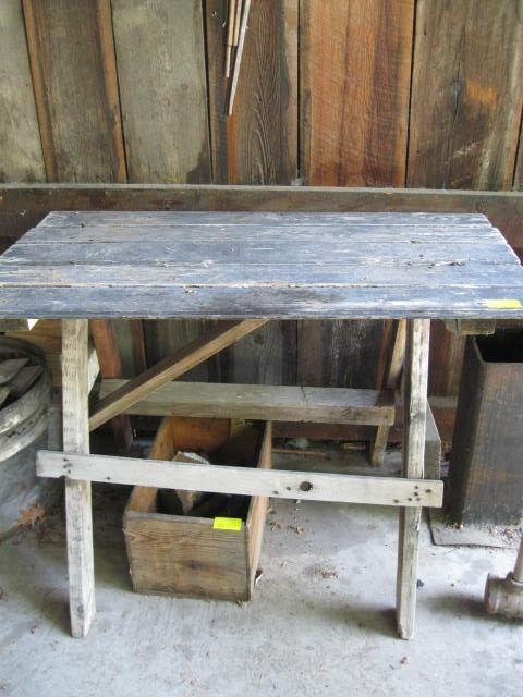 WOODEN CRATE W/MISC: WIRE BRUSH, MALLET, ETC. & RUSTIC WOODEN TABLE