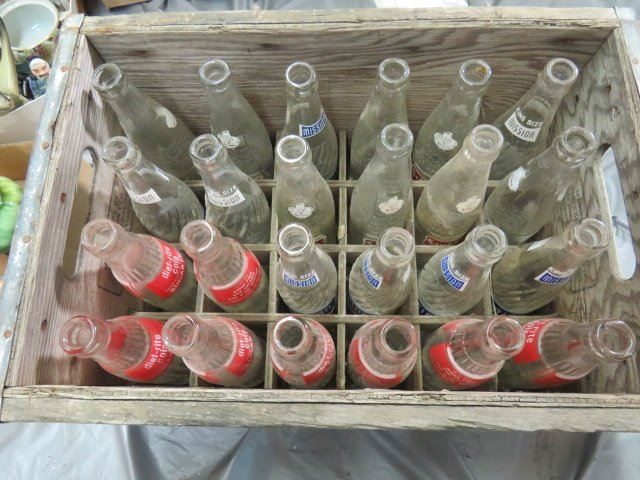 WOODEN CRATE WITH 24 POP BOTTLES (MISSION, STUBBY, DIET RITE, ETC)
