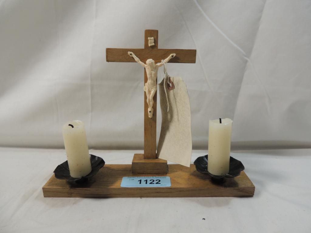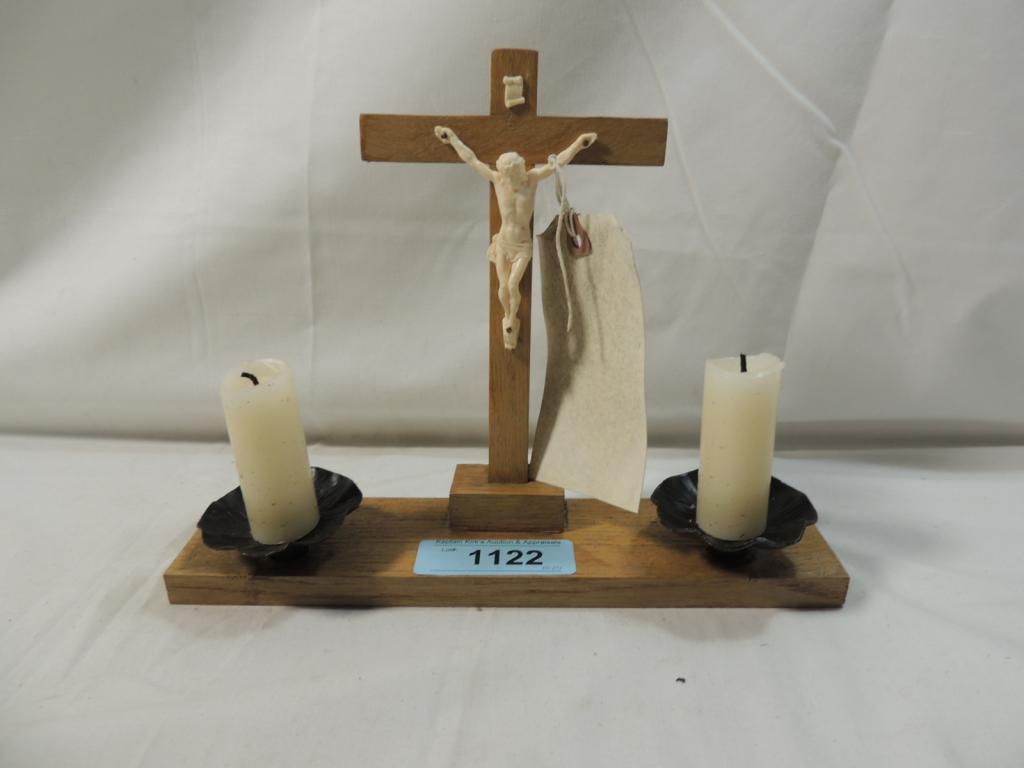 VINTAGE WOODEN CROSS AND JESUS CHRIST CRUXIFIX ON CROSS STANDING CANDLE DISPLAY AS SHOWN. SEE PHOTO FOR MORE DETAILS.