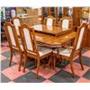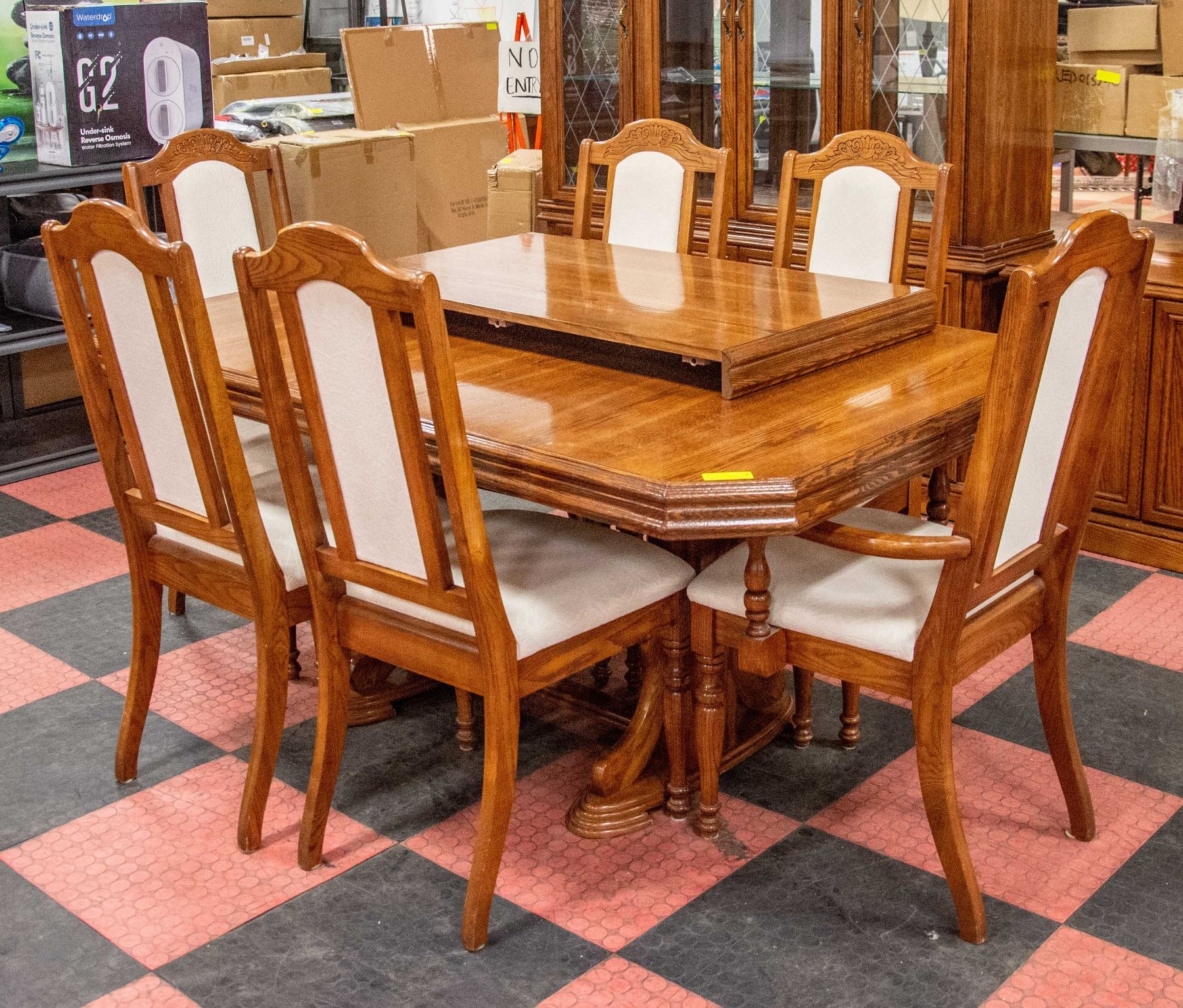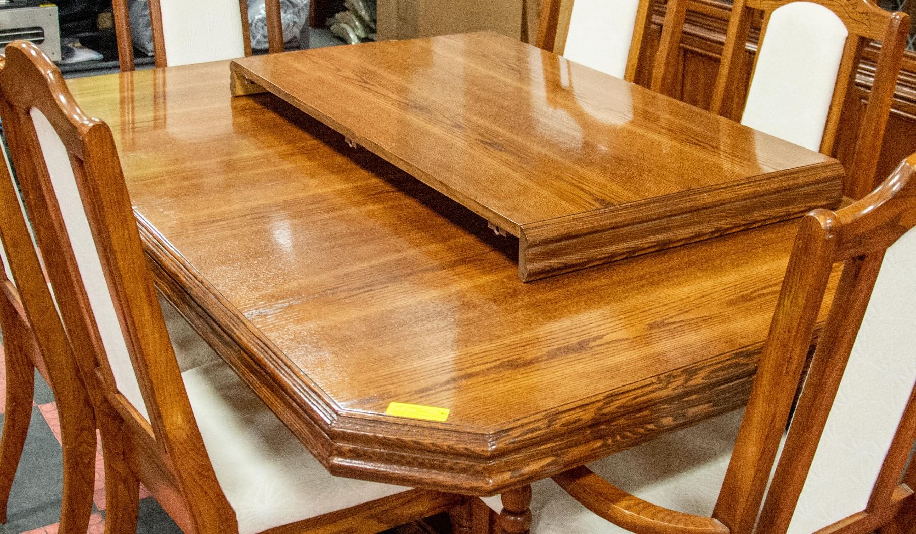 WOODEN DINING TABLE WITH LEAF INSERT + CHAIRS