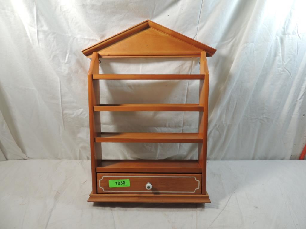 WALL DISPLAY SHELF, WOODEN DISPLAY SHELF WITH DRAWER, DECORATIVE SHELF AS SHOWN SEE PHOTO FOMROE DETAILS.