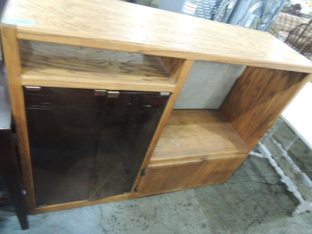 OAK? DECORATIVE WOODEN ENTERTAINMENT CENTER WITH STORAGE, ENTERTAINMENT CABINET, AS SHOWN SEE PHOTO FOR MORE DETAILS.