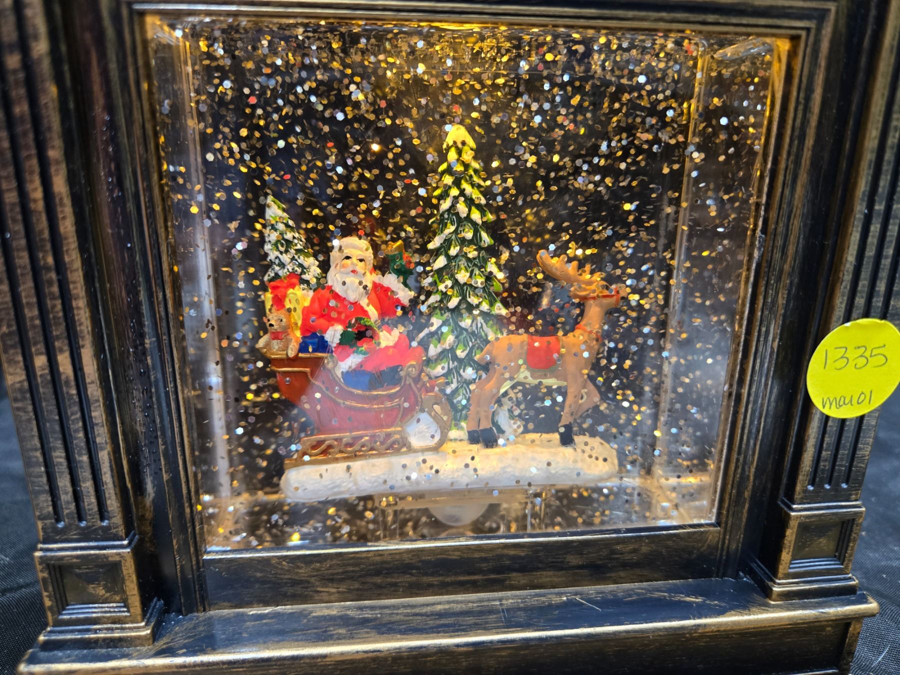 WOODEN FIREPLACE SANTA SNOW GLOBE. WORKS WITH BATTERIES (7 1/4" X 6.5" X 3 3/4")