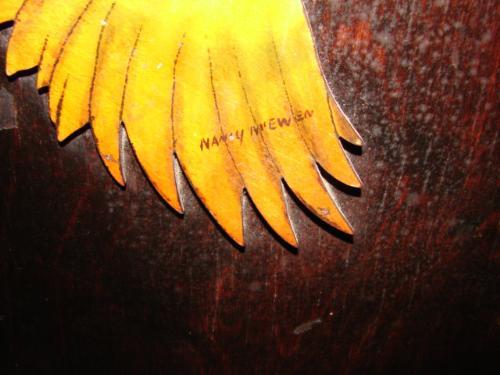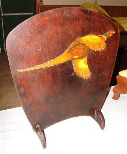 WOODEN FIREPLACE SCREEN. Has applied painted pheasant that is signed “Nancy McEwen”. 25.5” H, 22.25” W