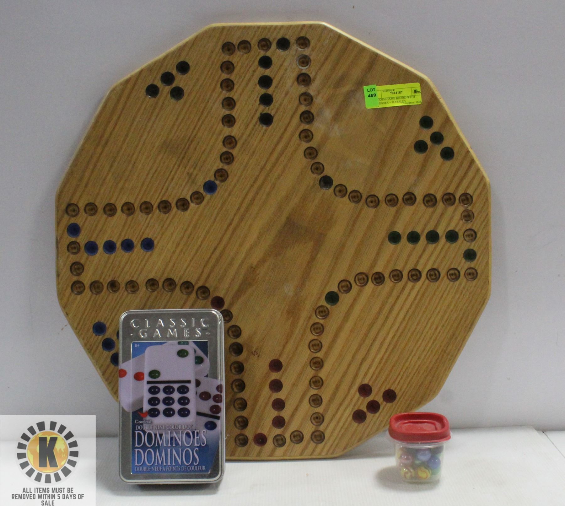 WOODEN GAME BOARD WITH DOMINOES + MARBLES
