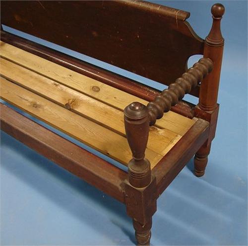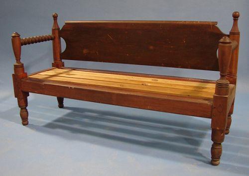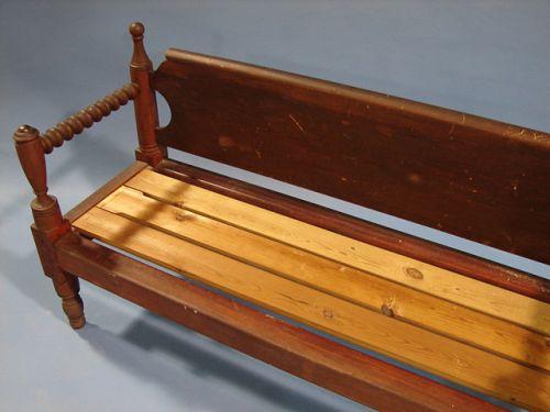WOODEN HALL BENCH. Redwashed. Turned legs & spooled arms. Pegged construction. No cushion. 29” H to top of back, 57” L, 20” D
