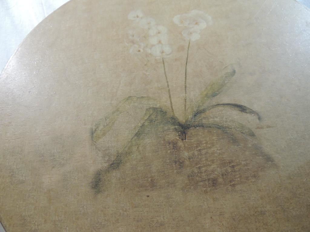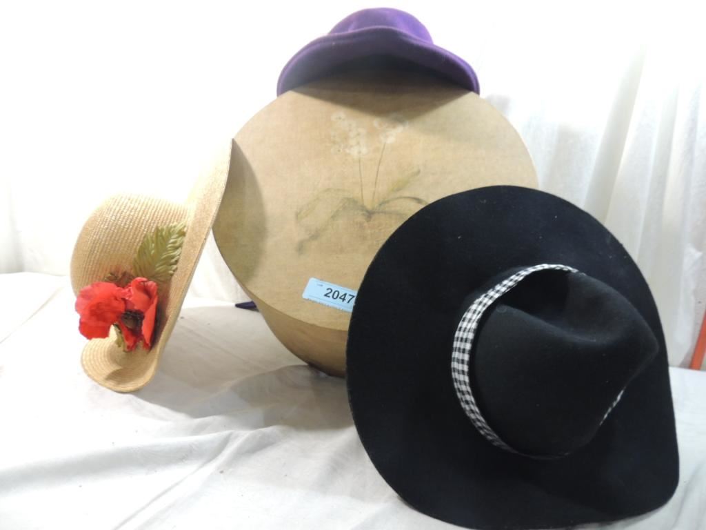 WOODEN HAT BOX, DECORATIVE HAT BOX, ORCHID HAT BOX, DECORATIVE, VINTAGE LADIES HATS, DECORATIVE HATS AS SHOWN SEE PHOTO FOR MORE DETAILS.