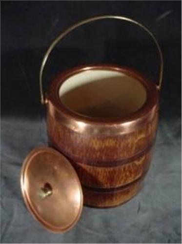 WOODEN HUMIDOR FASHIONED AFTER A BARREL WITH COPPERTONE HARDWARE. 5.5"X5.5".