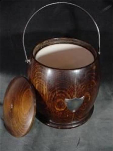 WOODEN HUMIDOR WITH CERAMIC INTERIOR AND SILVER METAL HANDLE. FINIAL ON TOP OF WOODEN LID IS MISSIN