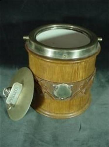 WOODEN HUMIDOR WITH CERAMIC INTERIOR, BRASS HARDWARE INCLUDING TRIM, LID, AND HANDLE. 5"X5". UNDERSIDE OF LID IS HEAVILY HALLMARKED AND TOP OF LID HAS "BISCUITS" WRITTEN ON A LABEL.