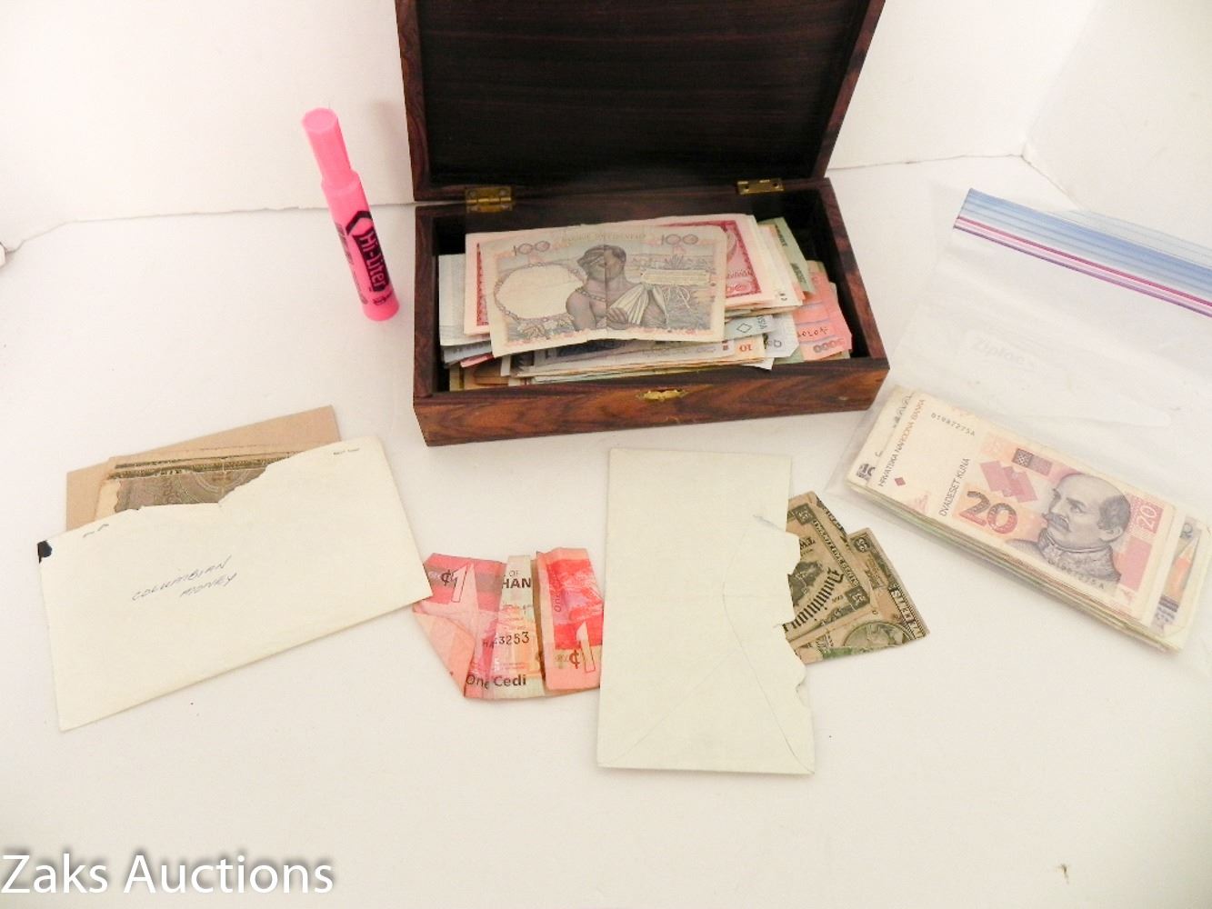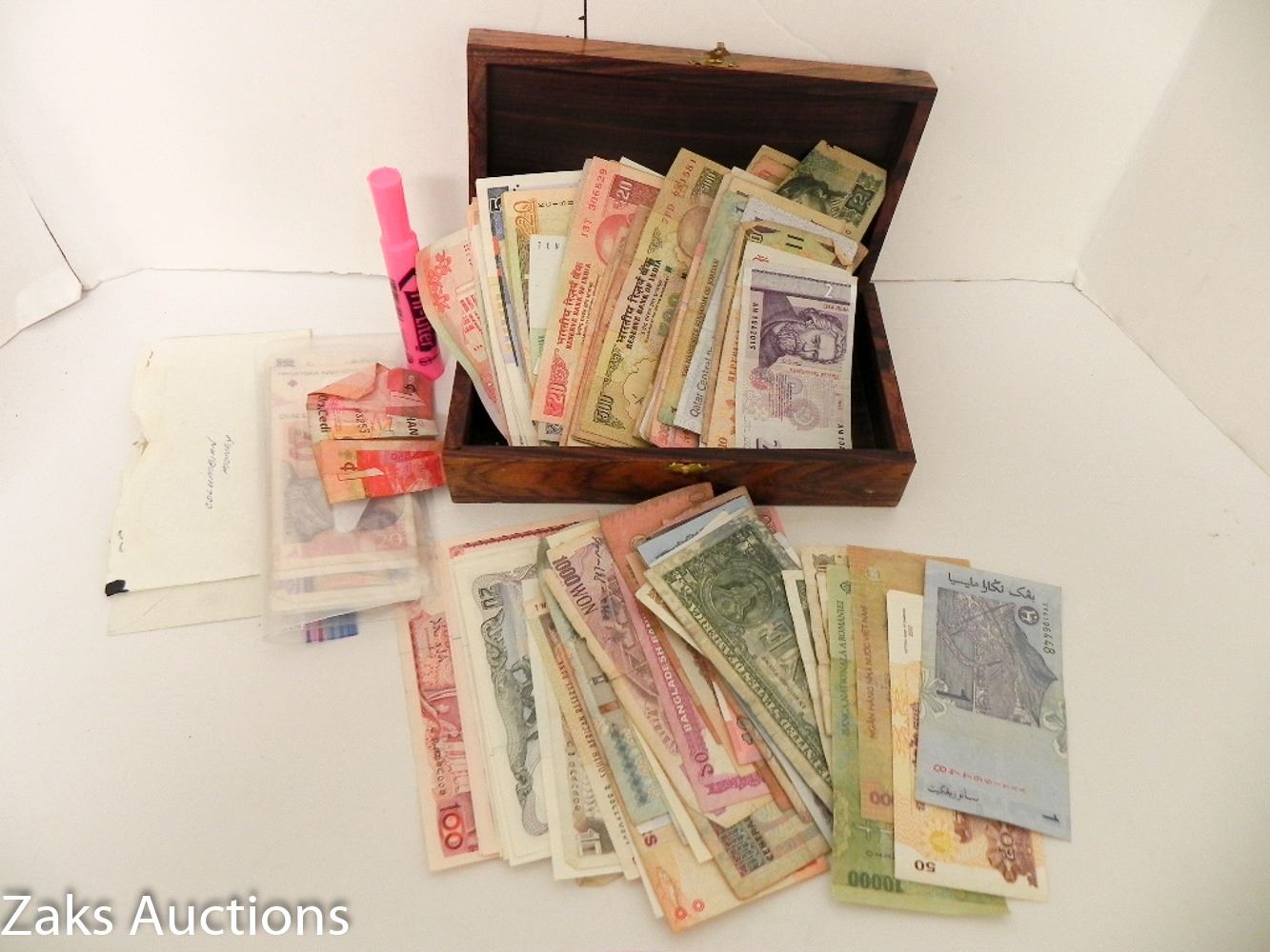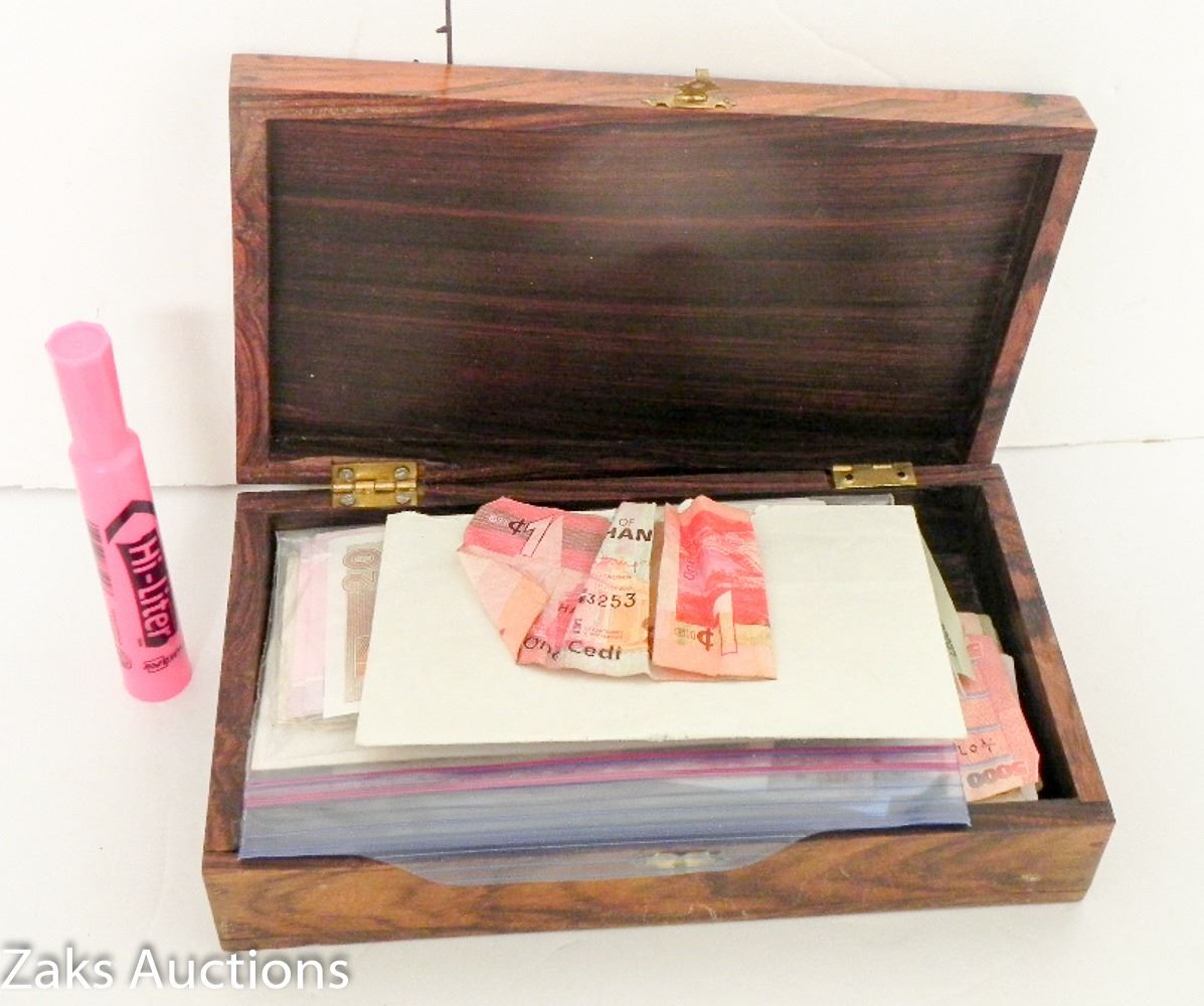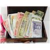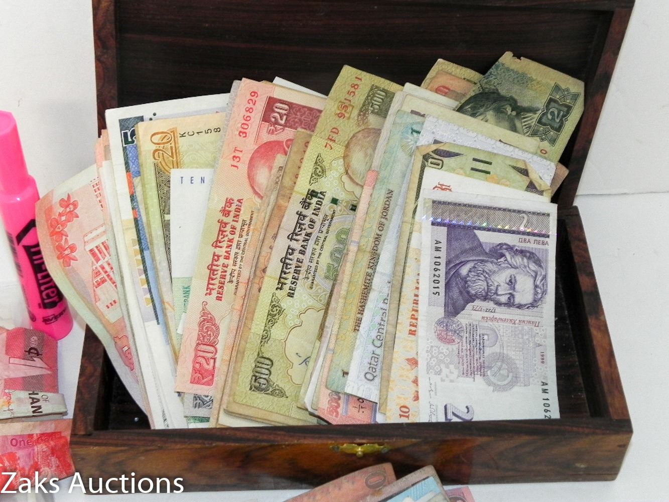 WOODEN JEWELLERY BOX WITH FOREIGN CURRENCY
