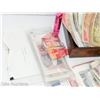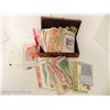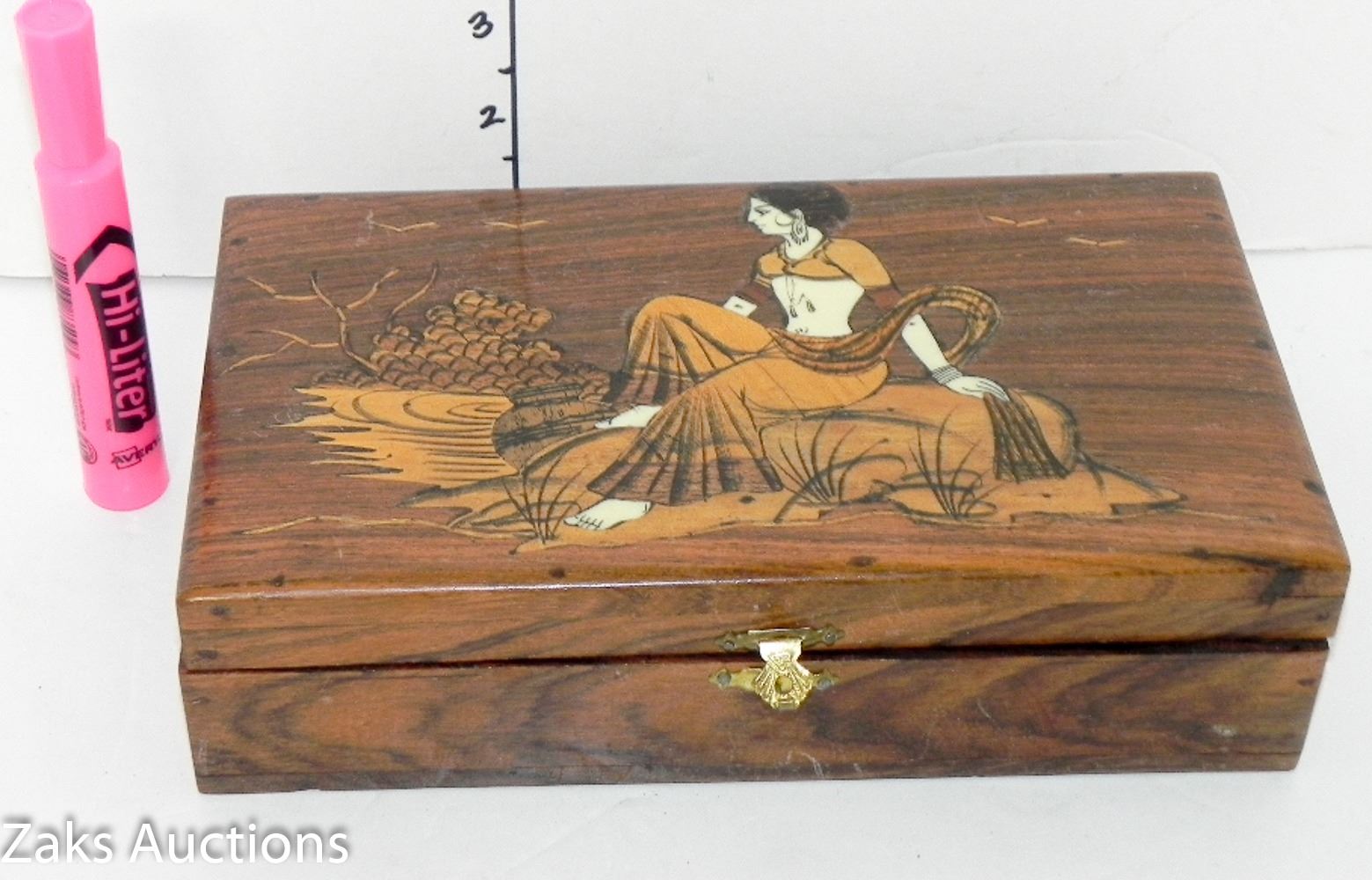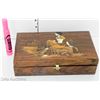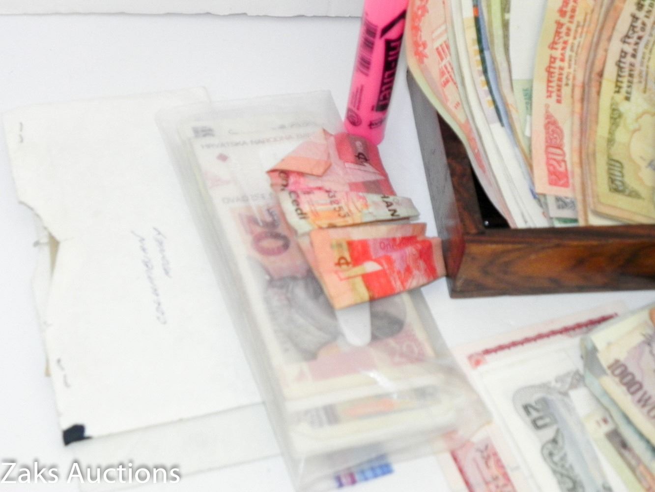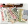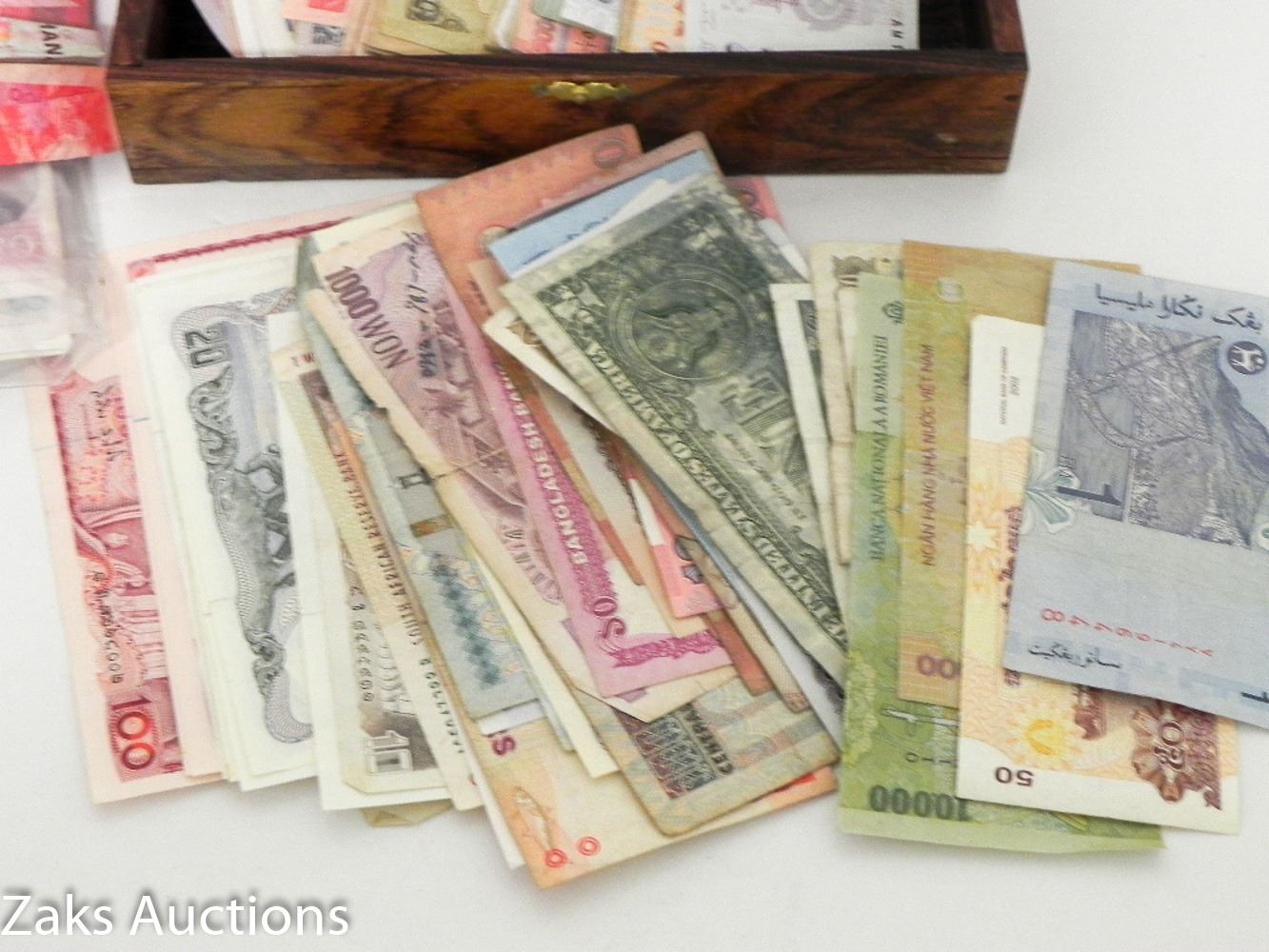 WOODEN JEWELLERY BOX WITH FOREIGN CURRENCY