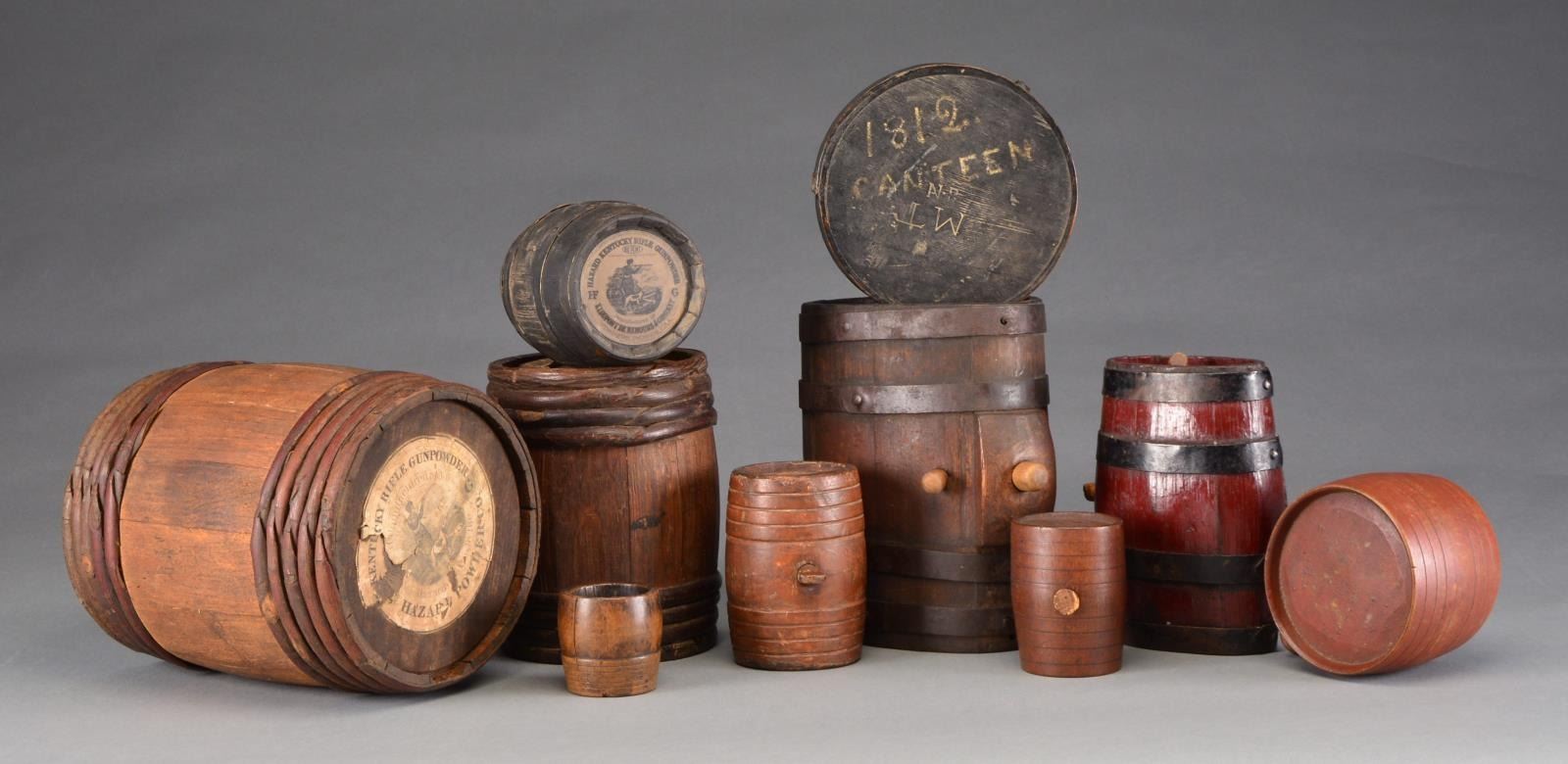 This fascinating lot consists of 1 powder keg measuring 10 1/2" x 8” w/ 5 twig hoops at the top & bottom. There is a rnd. partial label that reads in part, “KENTUCKY RIFLE GUN POWDER HAZARD POWDER CO”. / 1 Powder keg measuring 8 3/8” x 6 1/2” w/ 4 twig hoops at top & bottom. There is a rnd. partial label approx. 15% intact. / 1 Sm. powder keg measuring 6” x 4 3/4" w/ 4 brass hoops & a label that in part reads, “HAZARD KENTUCKY GUN POWDER”. / 1 Carved & red painted canteen measuring 3 5/8” x 4 5/8”. Handcarved ends w/ a turned body & stopper. Red paint appears original. / 1 Cheese box style canteen w/ black paint overall. Commonly called a “US / MS” version, both the “US” & the “MS” are visible under the black paint. Painted inscription on 1 side reads, “1812. CANTEEN”. The center of the reverse is stamped “N.P” & is carved w/ the owner’s initials “MT”. / 1 Red painted ovoid barrel style canteen w/ 4 black painted iron hoofs. Body of canteen has later red paint. Canteen is likely not American & later 19th century. / 1 Wooden egg shaped barrel style canteen w/ 4 iron hoops & remnants of Spanish brown paint. Spout & air hole have the original carved wooden stoppers. / 1 Sm. rundlet measuring 4” x 2 3/4". Hand carved ends w/ turned body. Cork stopper. / 1 Medium rundlet measuring 5 1/2" x 3 1/4". Carved ends & turned body w/ original wooden stopper. / 1 Hand carved wooden cup w/ a visible drying crack. CONDITION: all pieces show moderate wear unless otherwise noted. All are complete w/ minor blemishes from normal wear & tear. PROVENANCE: From the Collection of John "Tim" Breth Jr. (02-13815/BF). $700-1,100