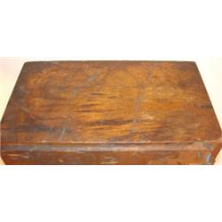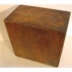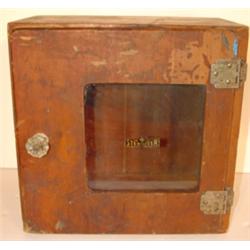 WOODEN MEDICINE CABINET with glass door & knob. Marked "Sterilizer" on glass door. Condition is fair with water staining on top and loss to original finish to door. 12.5" H, 12.5" W, 7.5" D