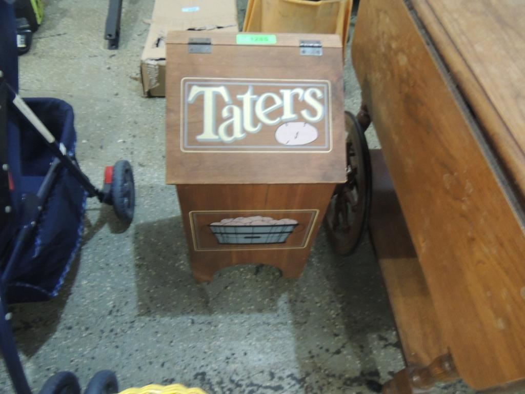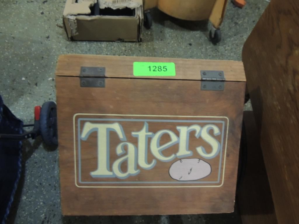 WOODEN POTATO STORAGE BOX, VINTAGE TATER BOX, WOODEN BOX, STORAGE BOX AS SHOWN SEE PHOTO FOR MORE DETAILS.