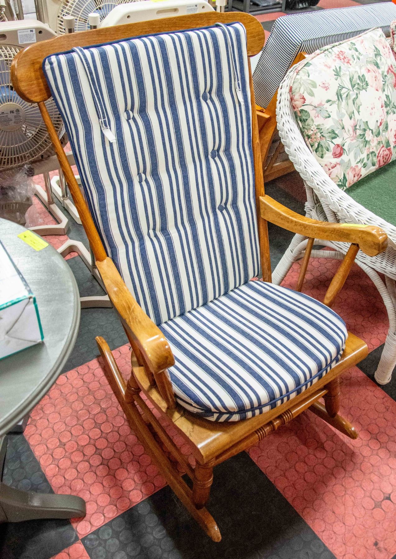 WOODEN ROCKING CHAIR W/ WHITE/BLUE CUSHION