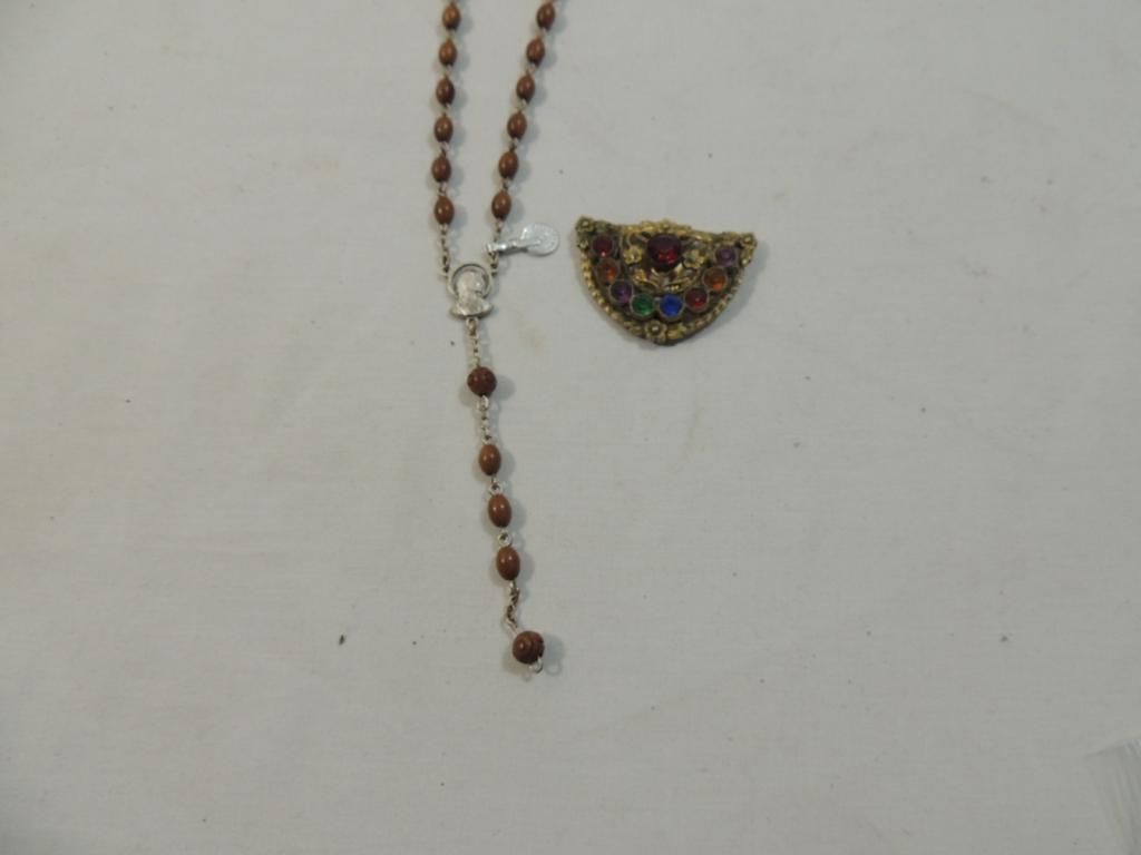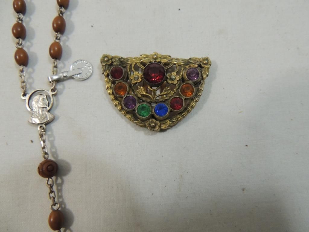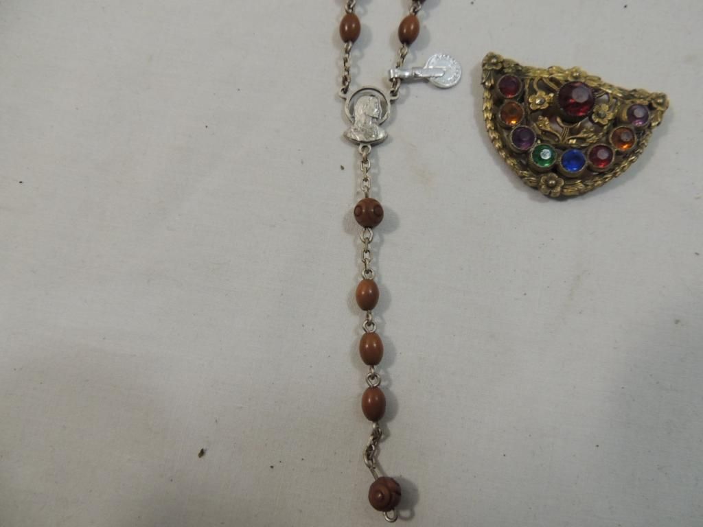 COLORFUL GOLDTONE AND JEWEL BROOCH BROACH WOODEN BEAD ROSARY AS SHOWN SEE PHOTO FOR MOR EDETAILS.