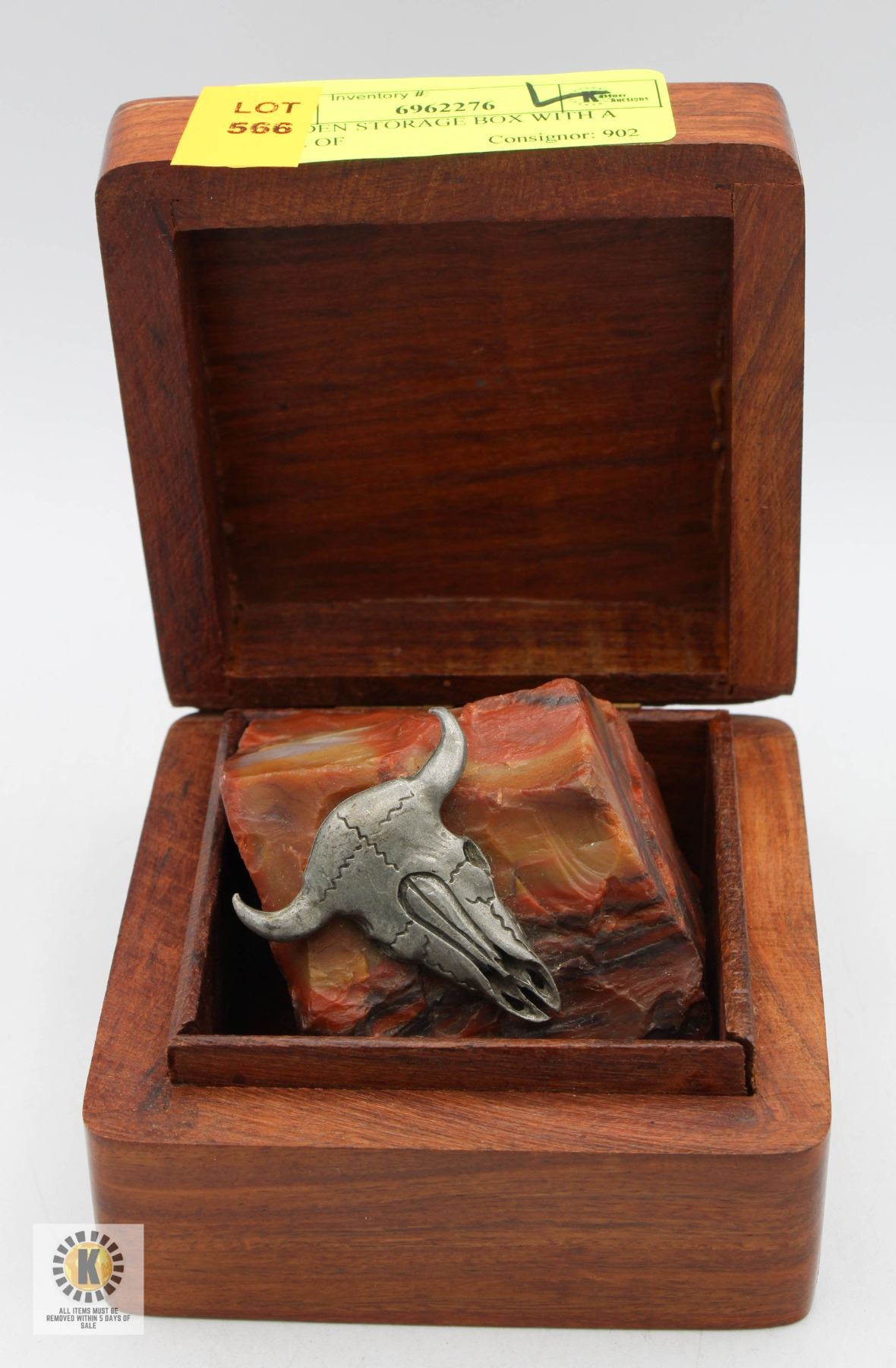 PETRIFIED WOOD WITH BULL HEAD SKULL (MEASURES: 3.5" X 2" X 2.5") **ALL ITEMS MUST BE REMOVED BY 5PM SATURDAY, APRIL 3RD 2025. ALL REMAINING ITEMS WILL BE SUBJECT TO A $6.00 PER DAY STORAGE CHARGE. ANY ITEMS REMAINING AFTER MONDAY, MAY 19TH 2025 WILL BE CONSIDERED FORFEITED. NO REFUNDS WILL BE ISSUED FOR FORFEITED ITEMS. TO SCHEDULE A PICK UP APPOINTMENT CLICK HERE