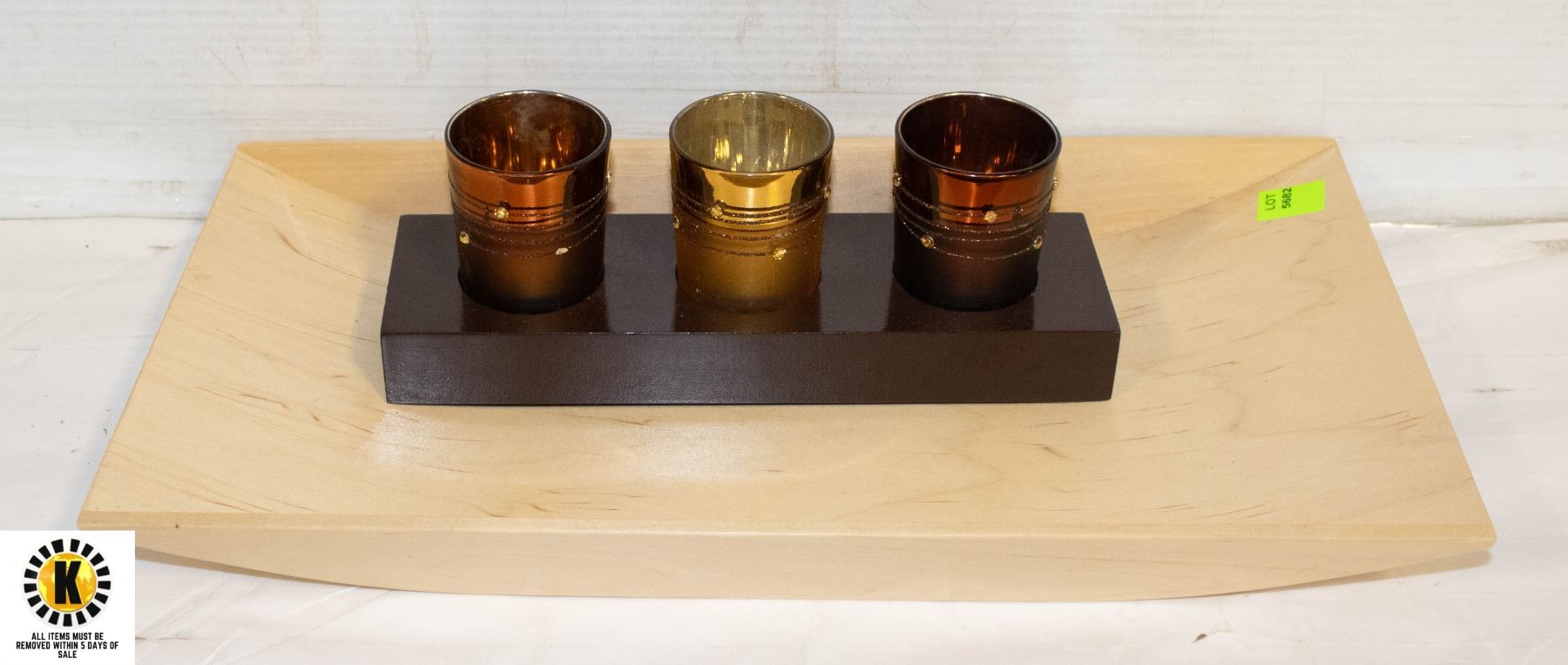 WOODEN TRAY WITH 3 ORNAMENTAL GLASSES