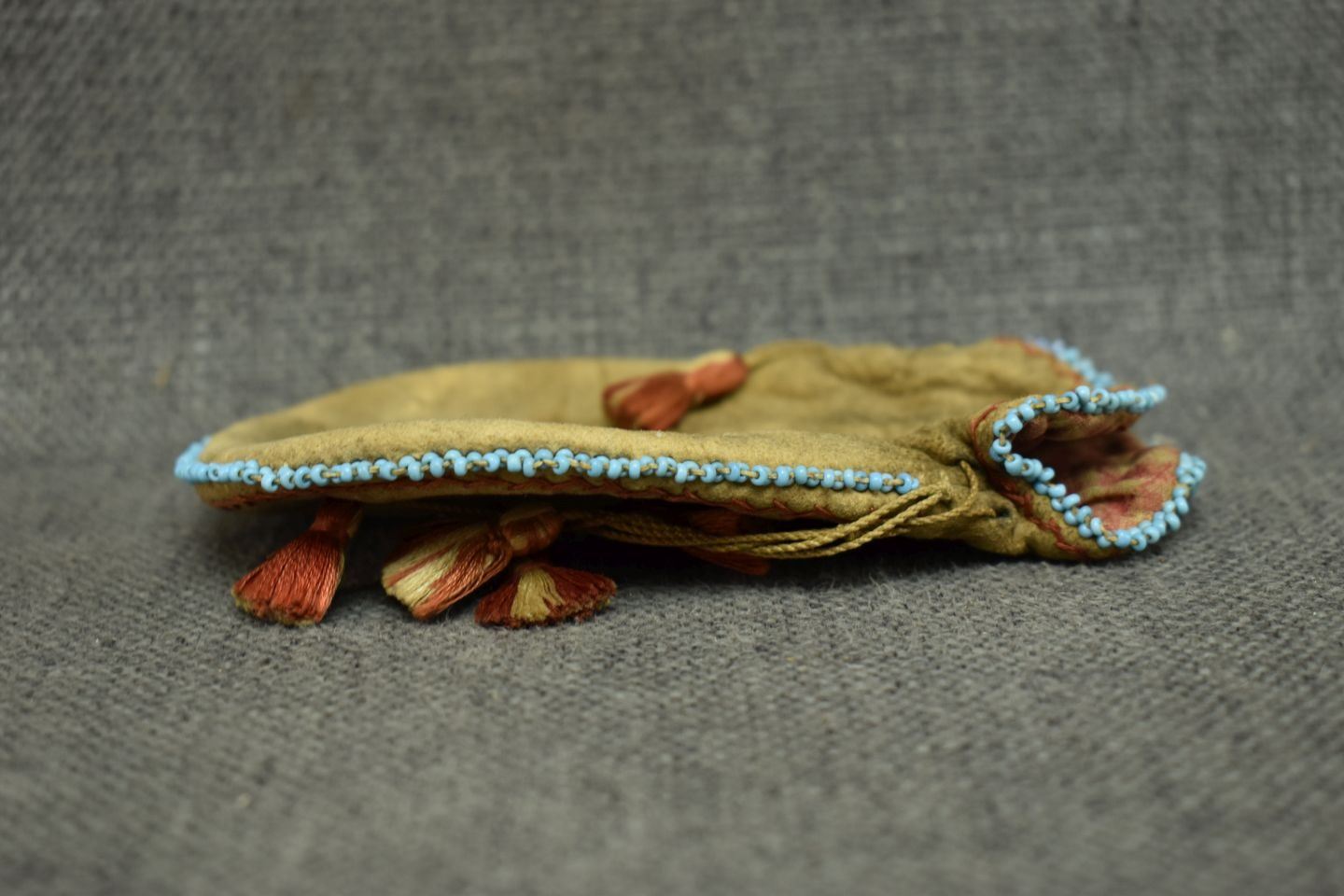 1900-10's woodland Indian hand made from native tanned leather with beaded and embroidered floral design, cloth lined 5.25" x 4"