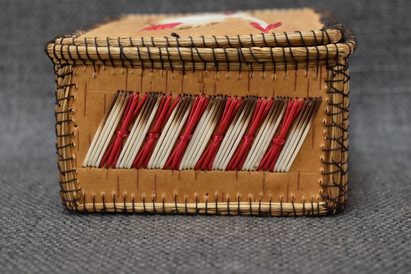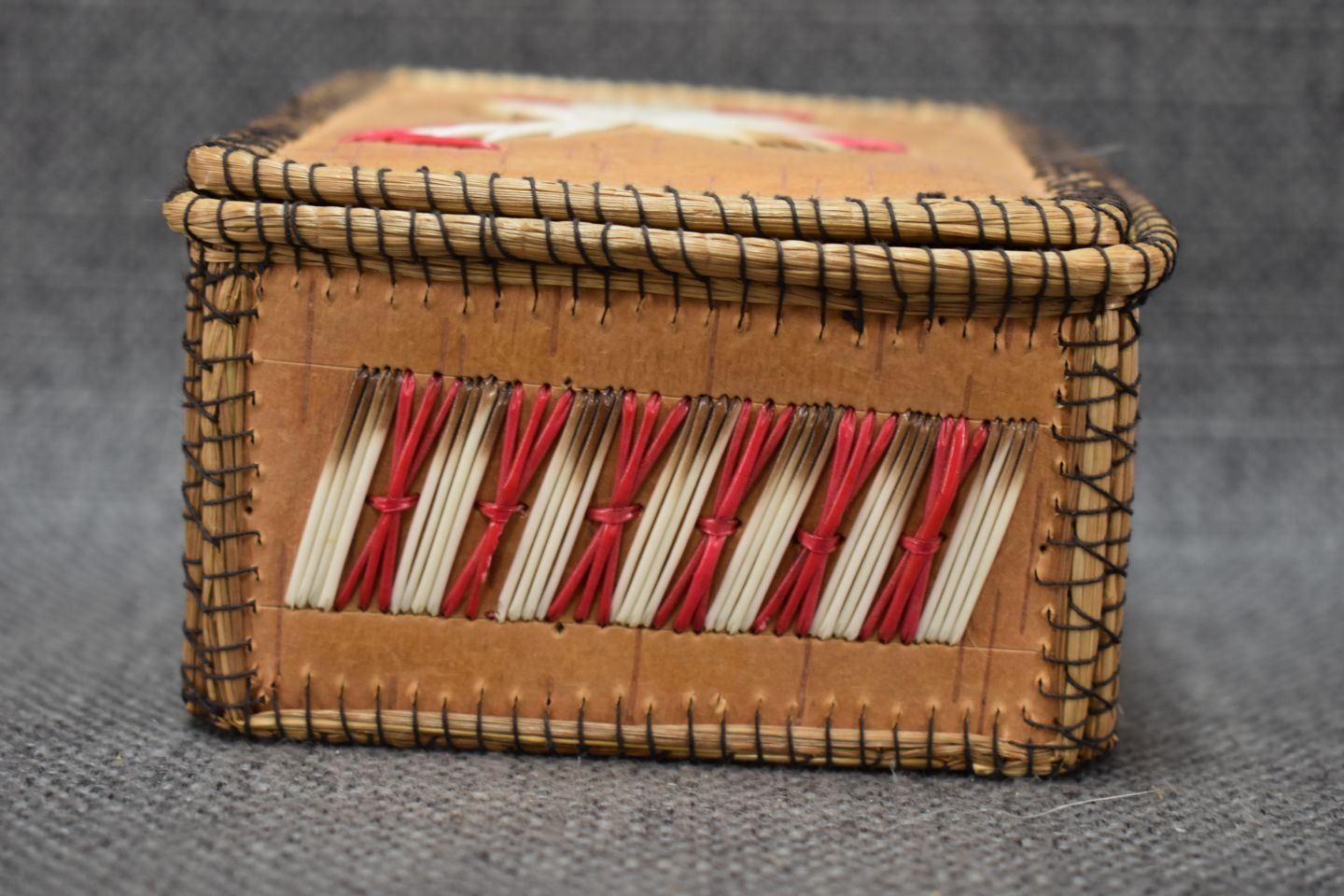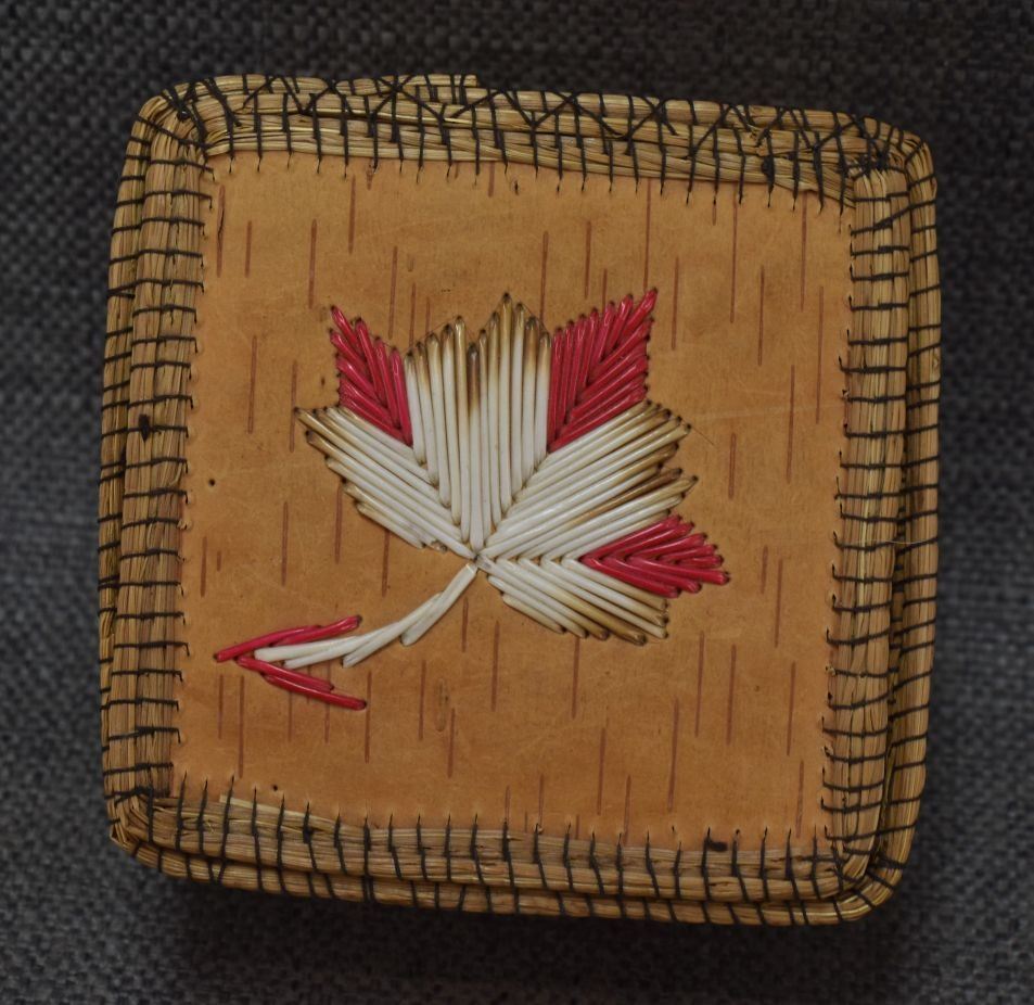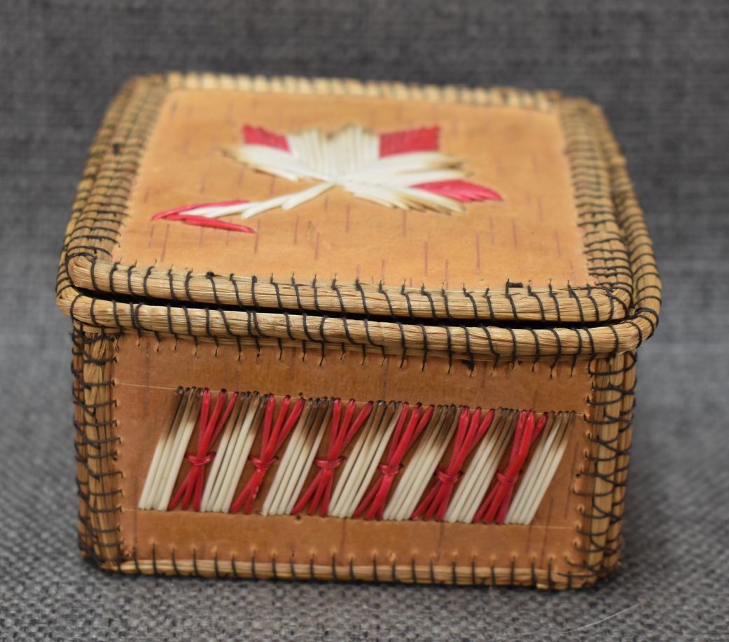 1960-70's Woodlands Indian hand made birchbark box with quilled design 2.25" x 4"