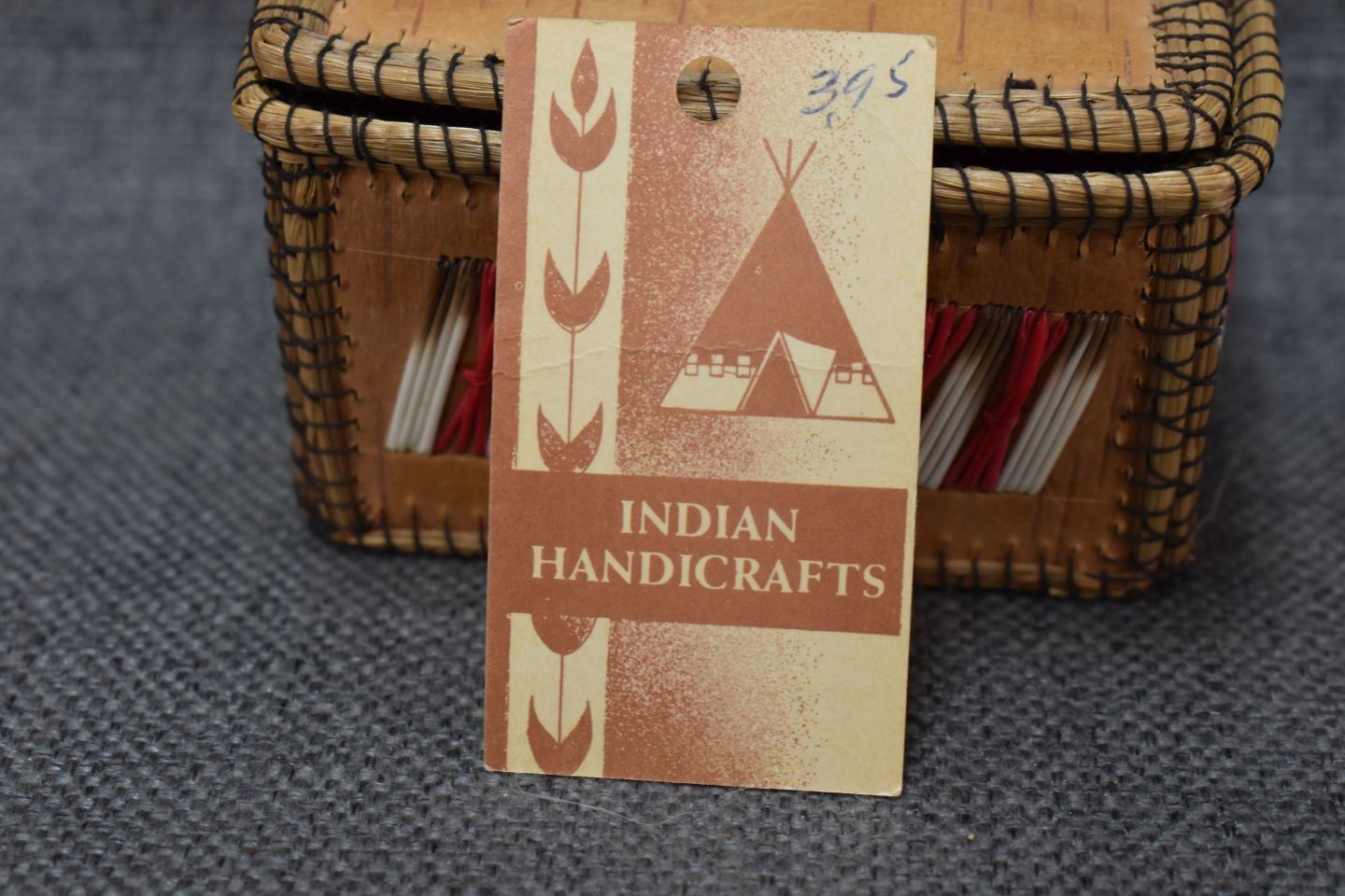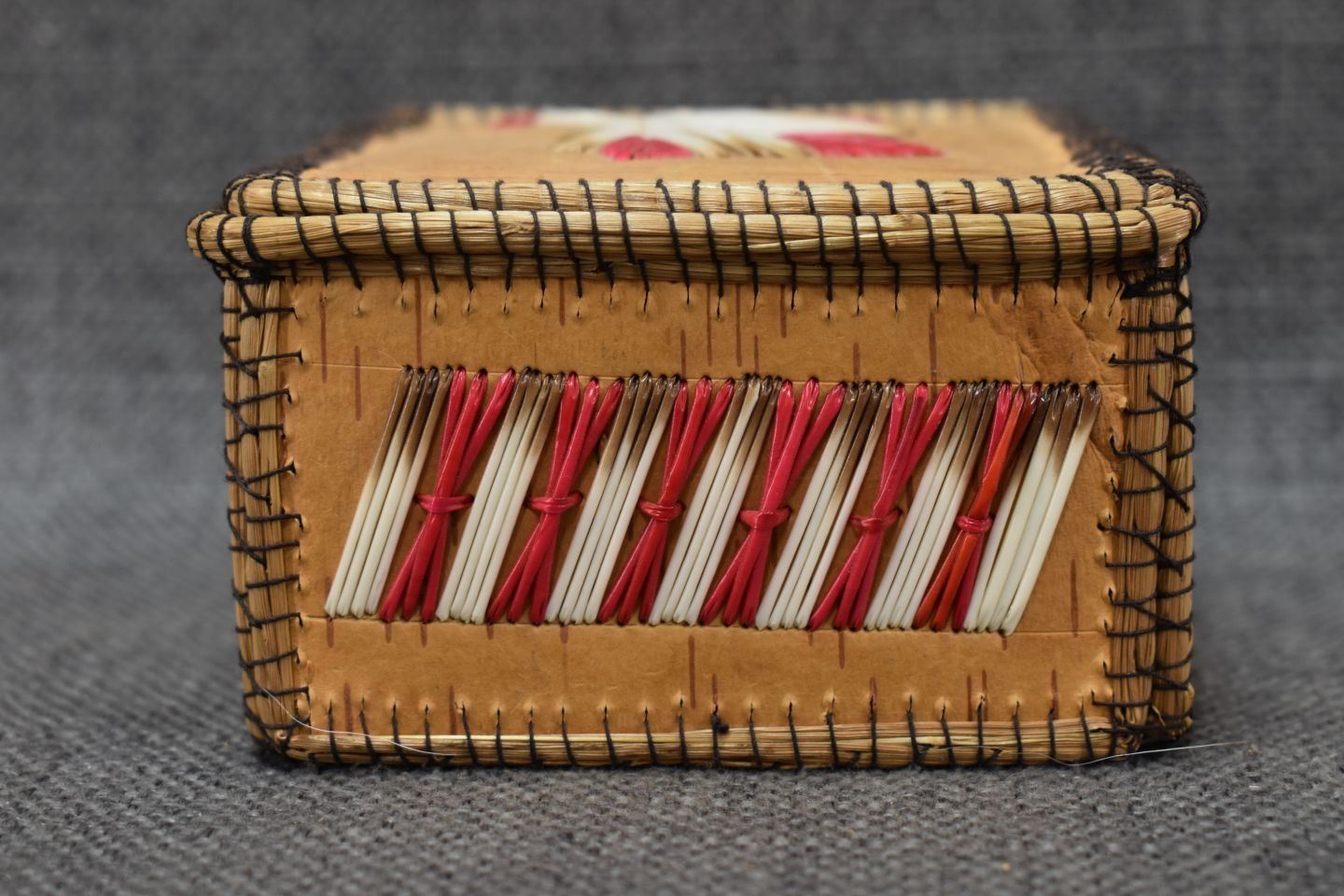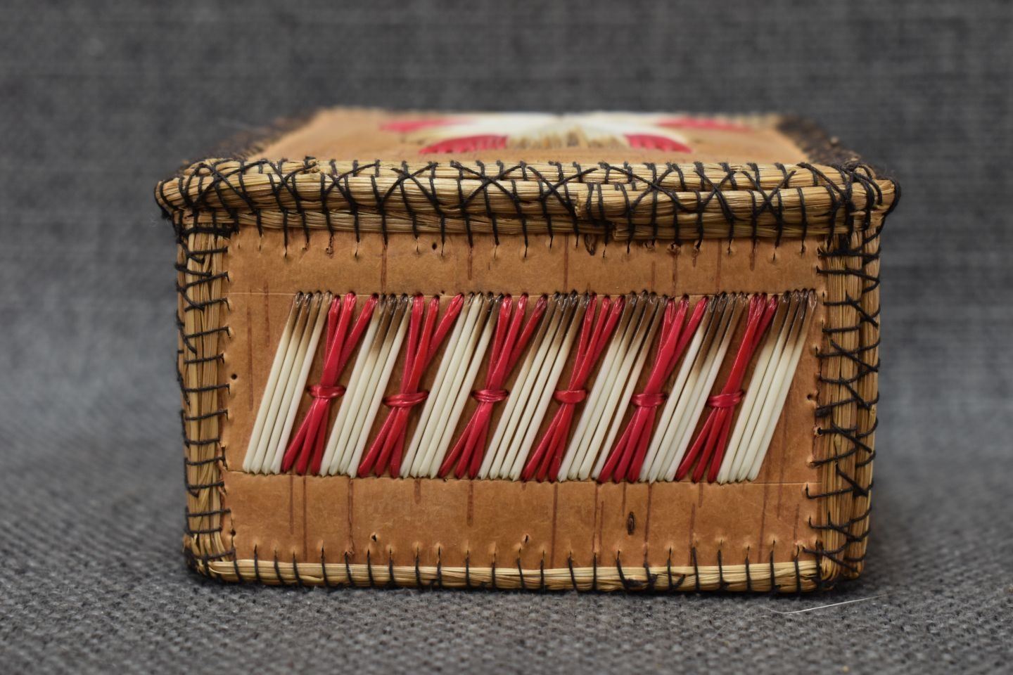 1960-70's Woodlands Indian hand made birchbark box with quilled design 2.25" x 4"