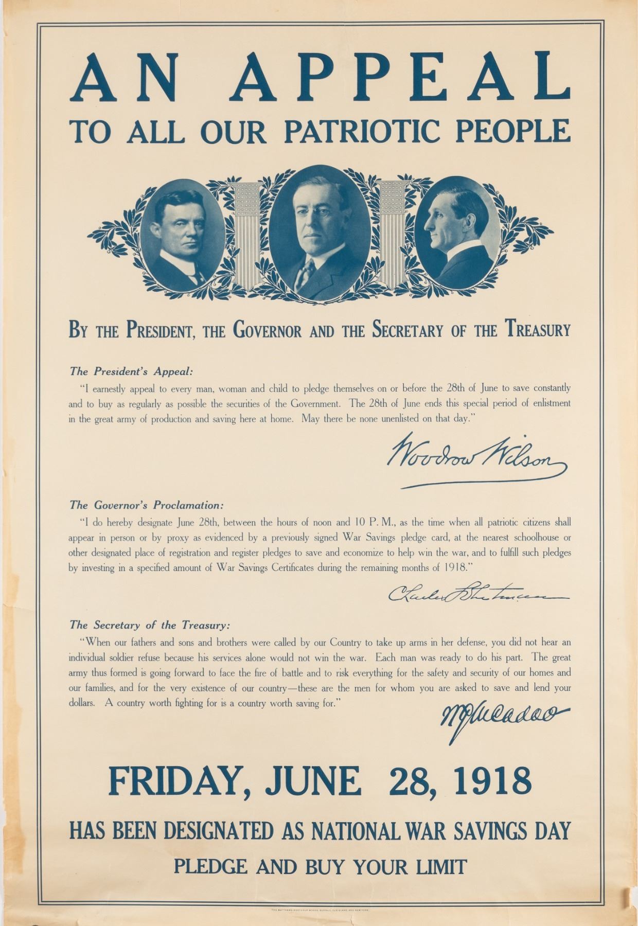 Woodrow Wilson 'An Appeal to All Our Patriotic People', Matthews-Northrup Works, 1918, 28 x 41.5 inches. The president's appeal 'I earnestly appeal to every man, woman and child to pledge themselves on or before the 28th of June to save constantly and to buy as regularly as possible the securities of the Government. The 28th of June ends this special period of enlistment in the great army production and saving here at home. May there be none unenlisted on that day.' Minor tears and minor damage on edges.