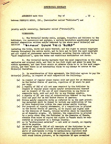 (1912 - 1967) American song writer and musician, , considered the "Father of American Folk music", best known for his masterpiece, "This Land Is Your Land." Typed D.S. signed three times, 4pp. 4to., New York, [n.d., ca. 1960], in which Guthrie signs over his rights to the song "Blowin' Down This Road" to People's Songs, Inc. People's Songs was a label and organization formed by Guthrie in 1945 to distribute folk music. Light toning, else fine. This song also had several variations, its most moder being "Goin' Down the Road", most notably performed by the Grateful Dead with some lyrics idential to those written by Guthrie.