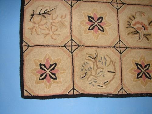 WOOL HOOKED RUG. Decorated with floral decoration and cream, brown, and pink colors. 60” x 35.5”