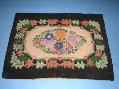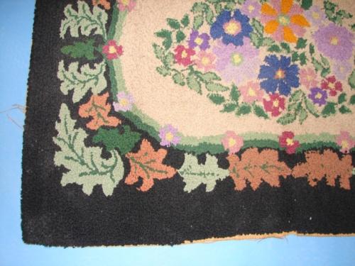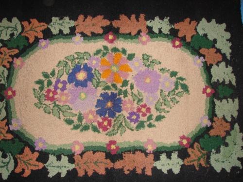 WOOL HOOKED RUG. Decorated with floral decoration at center with brown and green leaves and dark brown background. 52” x 38.5”