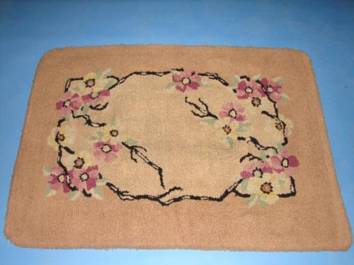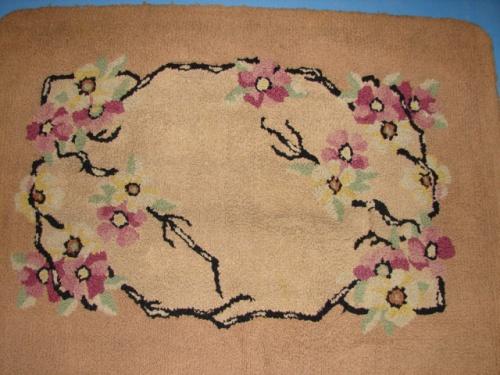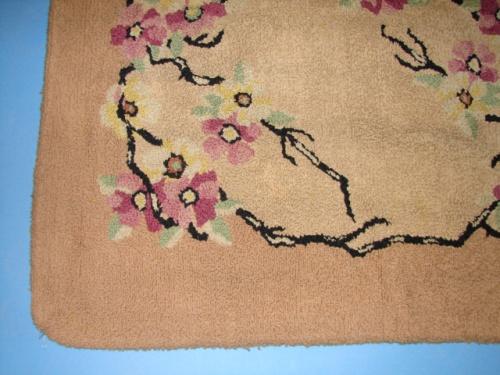 WOOL HOOKED RUG. Decorated with dogwood decoration on tan and light brown background. Dated on reverse 1954. 51” x 37.5”