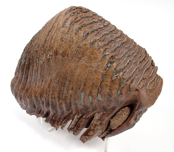 WOOLLY MAMMOTH TOOTH. Wooly Mammoths (Mammuthus primigenius) had the largest individual teeth of any animal that ever lived. Mammoths had six pairs of molars in both their upper and lower jaws during their lifetime. Each new molar would be larger than the preceding one and this gigantic 8 x 11.5 inch near perfect molar was one of the very last sixth molars. The flat part of the tooth with the alternating enamel and dentine layers is 8 inches long, the huge 11.5 inch root is virtually complete with just a couple of minor chips on the end and the whole tooth is a rich dark brown color with very smooth surfaces with no chips as normally found. Most Mammoth teeth come from the North Sea where they are dredged up in fishing nets resulting in sea damage, cracks and missing pieces but this museum quality tooth is 30,000-75,000 years old and was found in the frozen tundra of Siberia, Russia where the best preserved Mammoths are found.